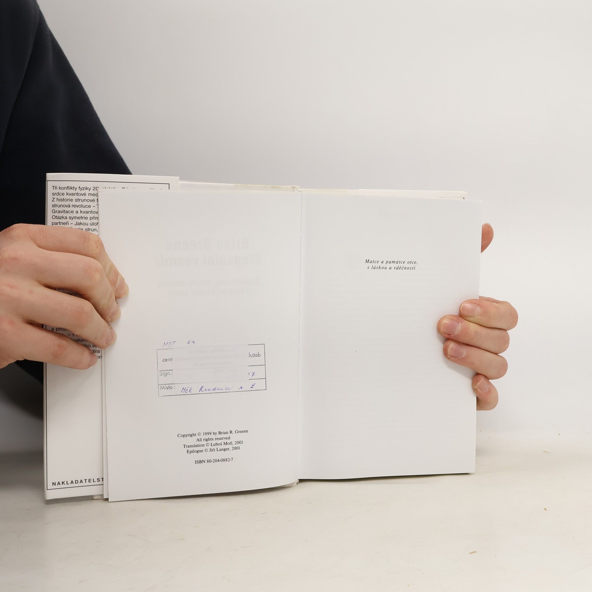 Podtitul: superstruny, skryté rozměry a hledání finální teorie Bestseller, který umožní čtenářům nahlédnout na vesmír novýma očima. Kniha pojednává o jedné z nejambicióznějších teorií, teorii superstrun. Tato teorie strun je klíčem k jednotné teorii pole, jež Einsteinovi unikala víc než třicet let. Věda konečně překonala nevraživost mezi zákony velkého – obecnou teorií relativity – a zákony malého – kvantovou mechanikou. Teorie strun obratně sjednocuje tyto pilíře moderní fyziky do jediného harmonického celku na základě tvrzení, že všechny úžasné události ve vesmíru jsou projevem chvění jediného objektu – mikroskopicky tenkých smyček energie existujících v srdci hmoty.... celý text