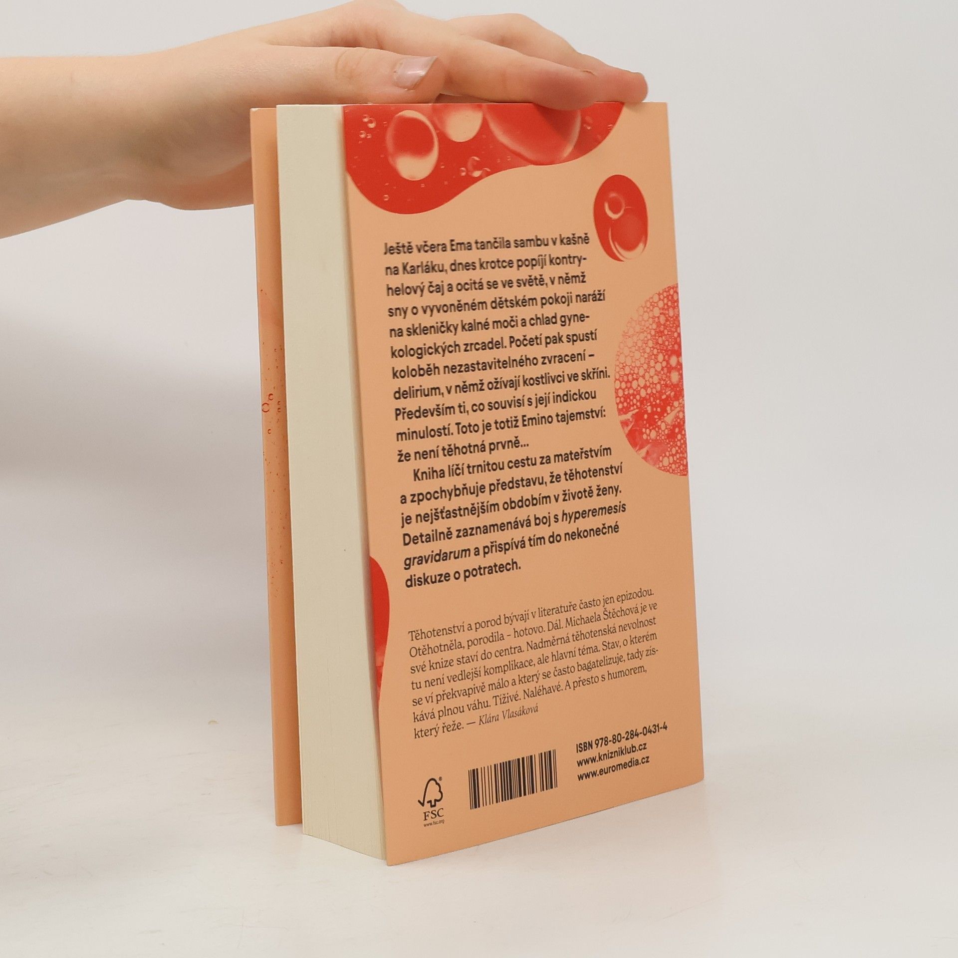 Ještě včera Ema tančila sambu v kašně na Karláku, dnes krotce popíjí kontryhelový čaj a ocitá se ve světě, v němž sny o vyvoněném dětském pokoji naráží na skleničky kalné moči a chlad gynekologických zrcadel. Početí pak spustí koloběh nezastavitelného zvracení – delirium, v němž ožívají kostlivci ve skříni. Především ti, co souvisí s její indickou minulostí. Toto je totiž Emino tajemství: že není těhotná prvně… Kniha líčí trnitou cestu za mateřstvím a zpochybňuje představu, že těhotenství je nejšťastnějším obdobím v životě ženy. Detailně zaznamenává boj s hyperemesis gravidarum a přispívá tím do nekonečné diskuze o potratech.
