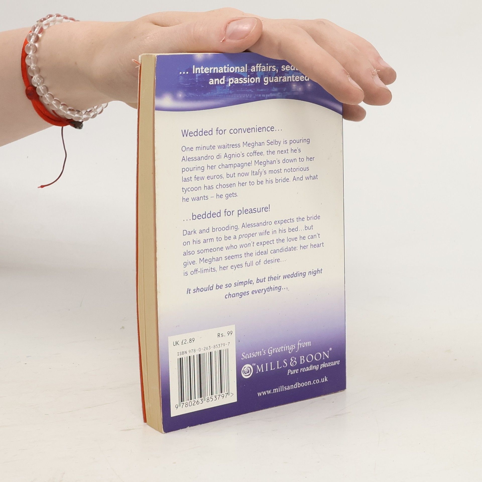 Wedded for convenience One minute, waitress Meghan Selby is pouring Alessandro di Agnio's coffee. The next, he's pouring her champagne Italy's most notorious tycoon has chosen his bride. Bedded for pleasure Alessandro expects a proper wife in his bed with no expectation of love. Meghan seems ideal; her heart off-limits, her eyes full of longing.
