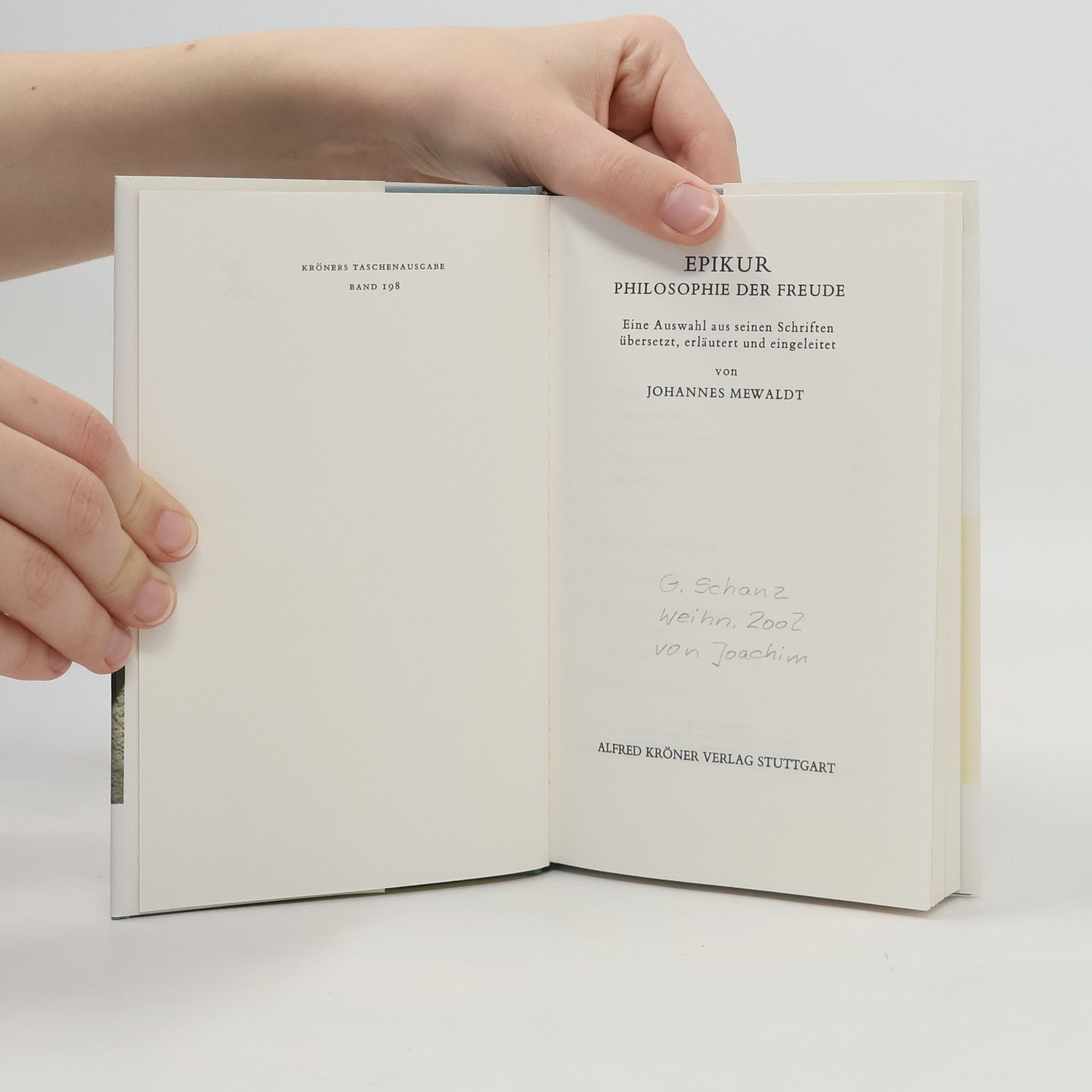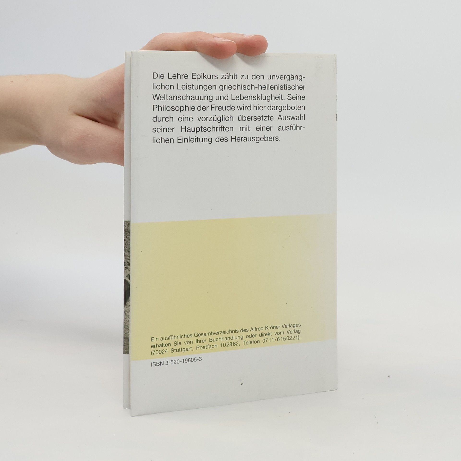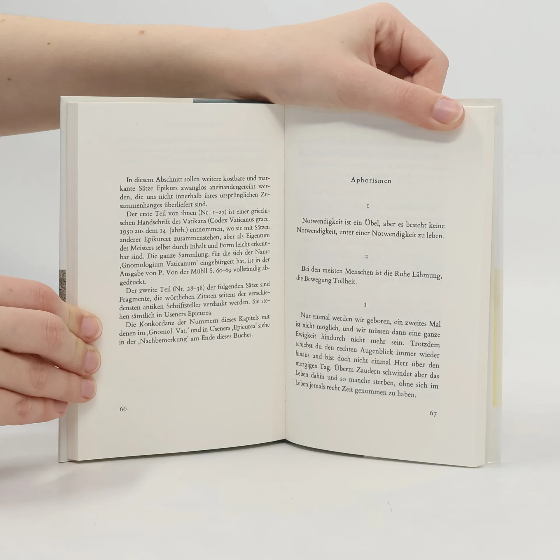 Epikurs Lehre lebenskluger Gelassenheit, die den Gefühlen von Lust und Schmerz einen realistischen Stellenwert zubilligt, wird hier in ihren Quellen dargeboten. Die Ausgabe enthält die beiden Briefe Epikurs an seine Schüler Menoikeus und Herodotus, die „Hauptlehrsätze“ sowie Aphorismen und Fragmente.