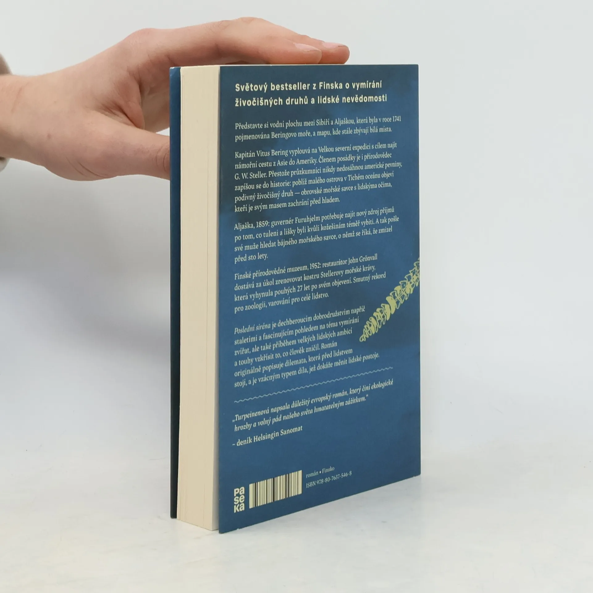 Přírodovědec a teolog Georg Wilhelm Steller se v roce 1741 připojuje k Velké severní expedici, při níž kapitán Vitus Bering a jeho posádka hledají námořní cestu z Asie do Ameriky. Přestože nikdy nedosáhnou americké pevniny, zapíšou se do historie: Objeví sirénu, nazývanou též ochechule nebo mořská kráva. Zhruba o sto let později vyšle Hampus Furuhjelm, finský guvernér ruského území Aljašky, své muže hledat kostru tohoto mohutného mořského savce, o němž se říká, že zmizel před sto lety. V roce 1952 dostává John Grönvall, restaurátor v dnešním Finském přírodovědném muzeu, za úkol zrenovovat kostru Stellerovy mořské krávy, která je v té době již vyhubená. Poslední siréna je dechberoucím dobrodružstvím napříč staletími a fascinujícím pohledem na téma vymírání živočišných druhů, ale také příběhem velkých lidských ambicí a touhy vzkřísit to, co člověk ve své nevědomosti zničil. Román originálně popisuje dilemata, která před lidstvem stojí, a je vzácným typem díla, jež dokáže měnit lidské postoje.