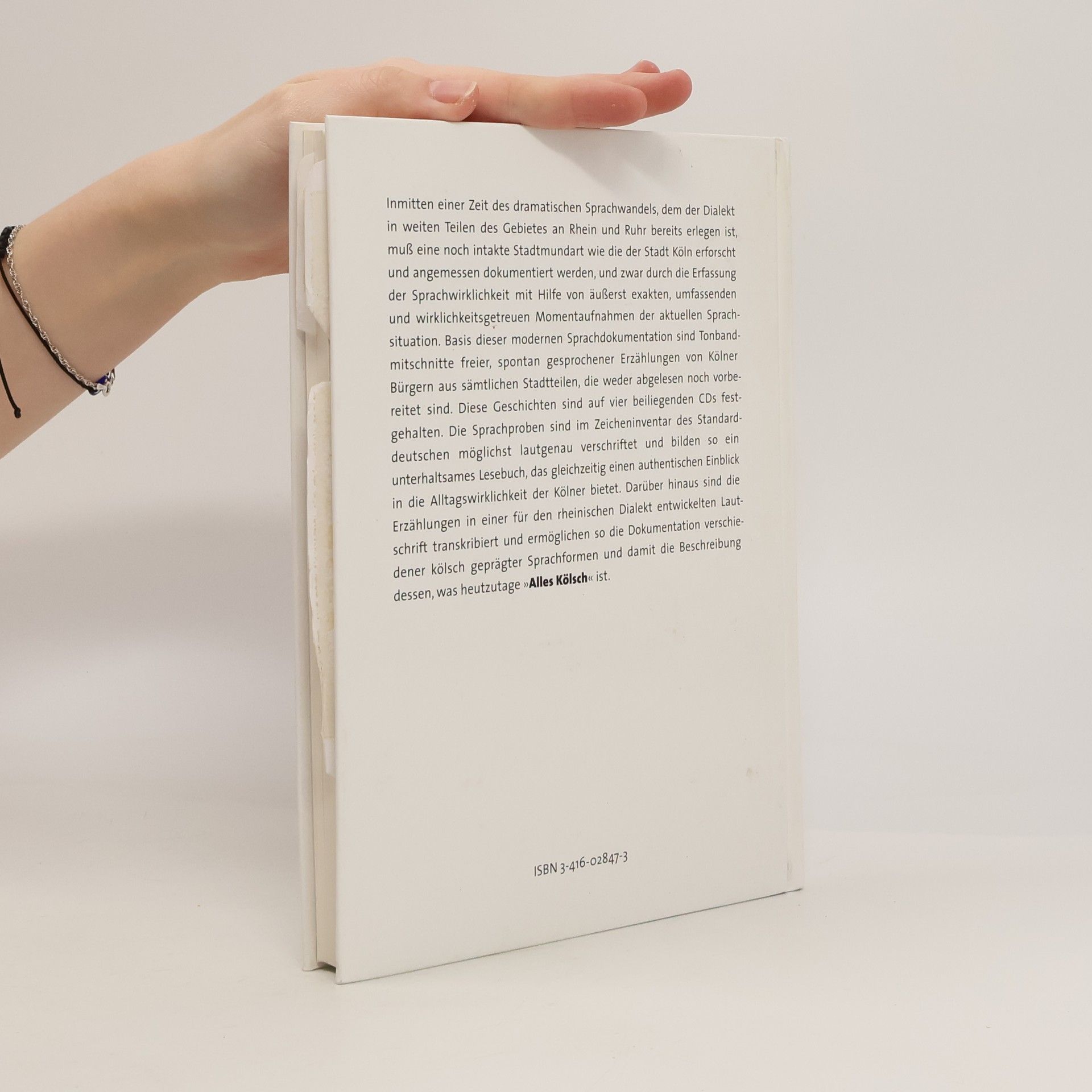 Spontan gesprochene Erzählungen von Kölner Bürgern aus sämtlichen Stadtteilen, die weder abgelesen noch vorbereitet worden sind, sind Basis dieser modernen Sprachdokumentation. Inmitten einer Zeit des dramatischen Sprachwandels, dem der Dialekt in weiten Teilen des Gebietes am Rhein und Ruhr bereits erlegen ist, muß eine noch intakte Stadtmundart wie die der Stadt Köln erforscht werden, und zwar durch die Erfassung der Sprachwirklichkeit mit Hilfe von äußerst exakten, umfassenden und wirklichkeitsgetreuen Momentaufnahmen der aktuellen Sprachsituation.
