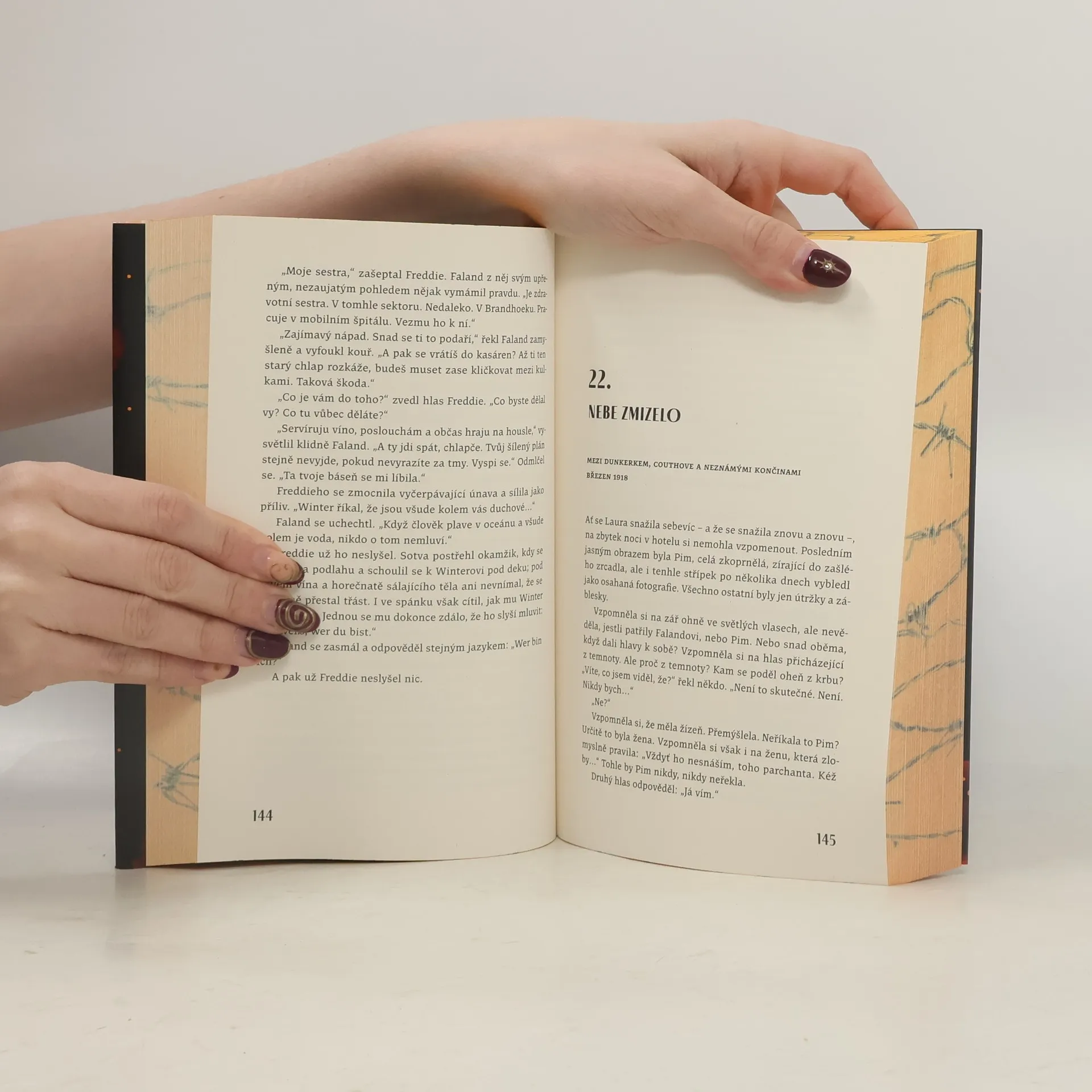 Leden 1918. Laura Ivenová se po zranění vrátila z fronty ve Flandrech domů. V Halifaxu teď ošetřuje oběti výbuchu munice na lodi Mont Blanc a s napětím čeká na zprávy od bratra Freddieho. Když jí z fronty pošlou jeho osobní věci, něco se jí na nich nezdá. Odhodlaná odhalit pravdu se jako dobrovolnice znovu vydá do Evropy, kde se dozví o zákopech, ve kterých straší, a o záhadném muži, který nabízí víno zapomnění. Listopad 1917. Vojín Freddie Iven procitne po výbuchu granátu z bezvědomí, jen aby zjistil, že vězí v bunkru se zraněným německých vojákem. Navzdory všemu si začnou navzájem pomáhat a rozhodnou se na frontu nevrátit. Kniha Laskavé ruce duchů je napínavý historický román se špetkou tajemna. Odehrává se během první světové války v kanadském Halifaxu a ve Flandrech a vypráví příběh o odvážné mladé ženě, silném poutu dvou sourozenců a nepravděpodobném spojenectví dvou nepřátel.
