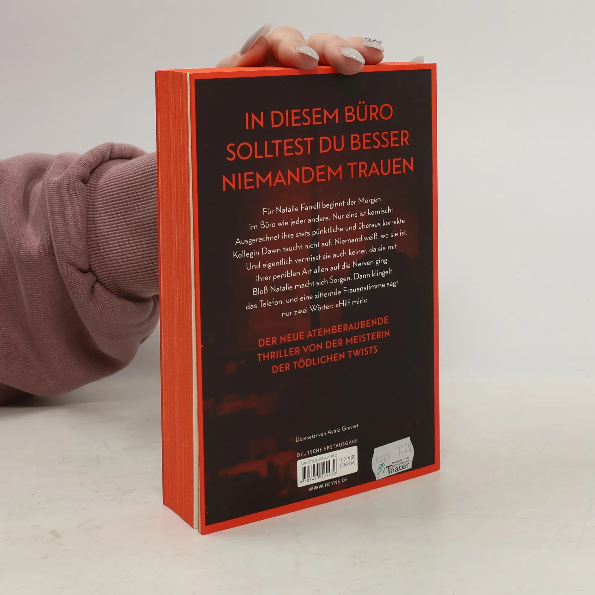 Zwei Frauen. Ein Büro. Ein schreckliches Verbrechen. Mit farbig gestaltetem Buchschnitt in limitierter Erstauflage Dawn Schiff ist seltsam. Darin sind sich ihre Kollegen einig. Sie sagt nie das Richtige. Sie hat keine Freunde. Aber sie ist jeden Morgen um Punkt 8:45 Uhr an ihrem Platz in der Firma, in der sie als Buchhalterin arbeitet. Bis sie eines Morgens nicht auftaucht. Dawns Kollegin Natalie Farrell wundert sich. Dann erhält sie einen anonymen Anruf und fährt zu Dawns Wohnung. Keine Spur von ihrer Kollegin. Doch Natalie bietet sich ein Bild des Grauens. Eins scheint bald klar: Jemand muss Dawn so sehr gehasst haben, dass er sie getötet hat. War es jemand aus ihrem Büro? Je mehr Natalie herausfindet, desto tiefer verstrickt sie sich selbst in ein Netz aus Lügen und Gewalt, aus dem es kein Entkommen gibt. Mit farbig gestaltetem Buchschnitt
