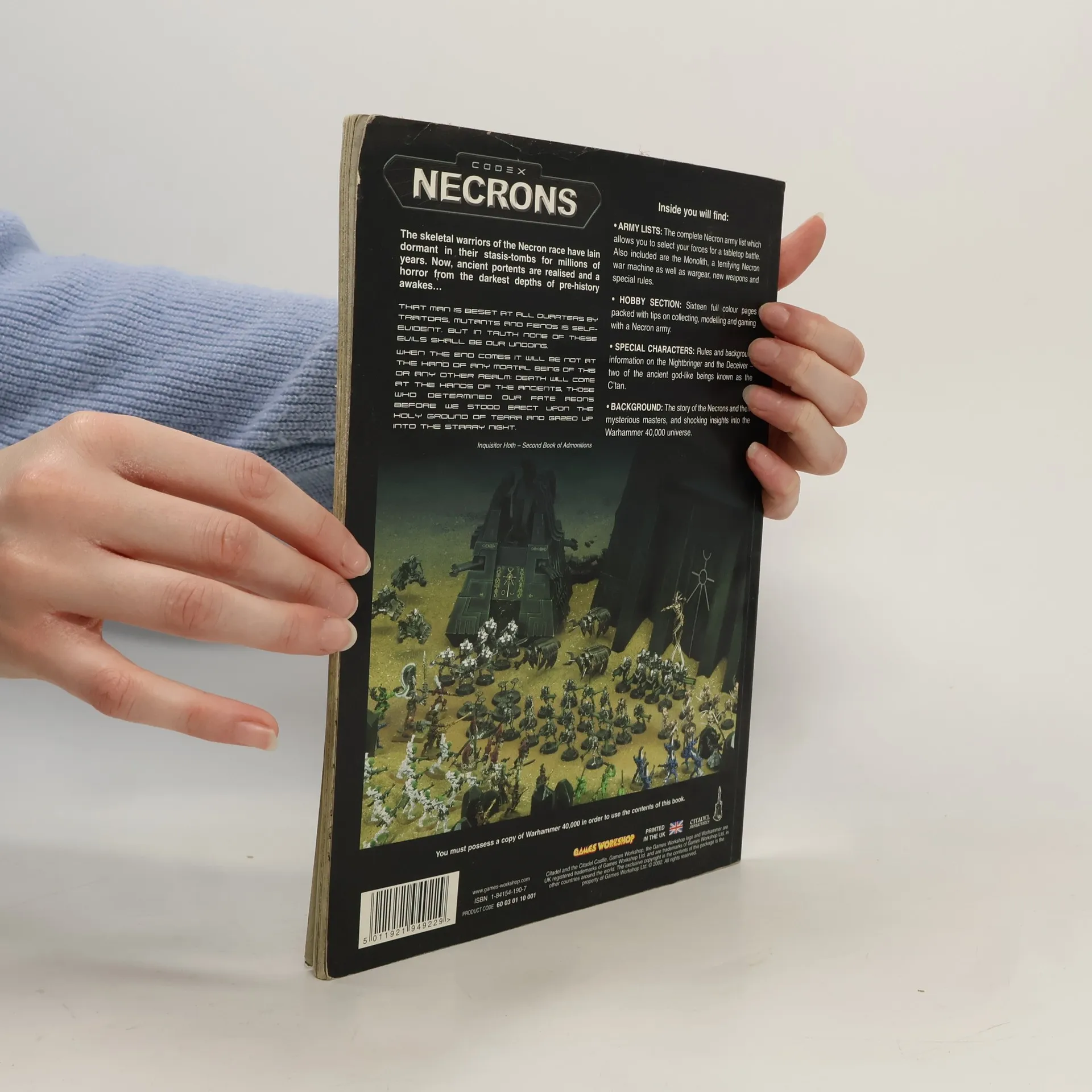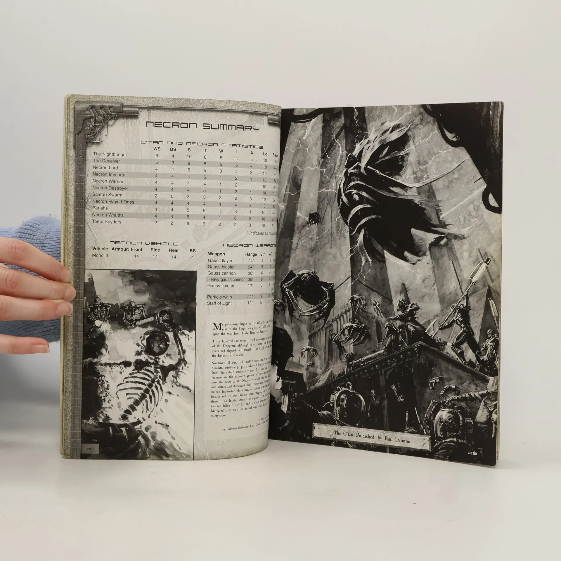 Welcome, mortal, to the pages of this most forbidden tome, a blasphemous text that will guide you down the path of collecting, painting and gaming with the Necrons int he Warhammer 40,000 game. The backbone of the Necron army is comprised of metallic, skeletal warriors that never truly die. Even their most basic weaponry can strip a man to his constituent atoms in a second. those with an inkling of the threat posed by the aeons-old Necrons fear them above all, and rightly so, for the true terror of the Necrons lies with their divine masters, whose ultimate goal is to enslave Humanity and gorge themselves on the essence of untold billions.