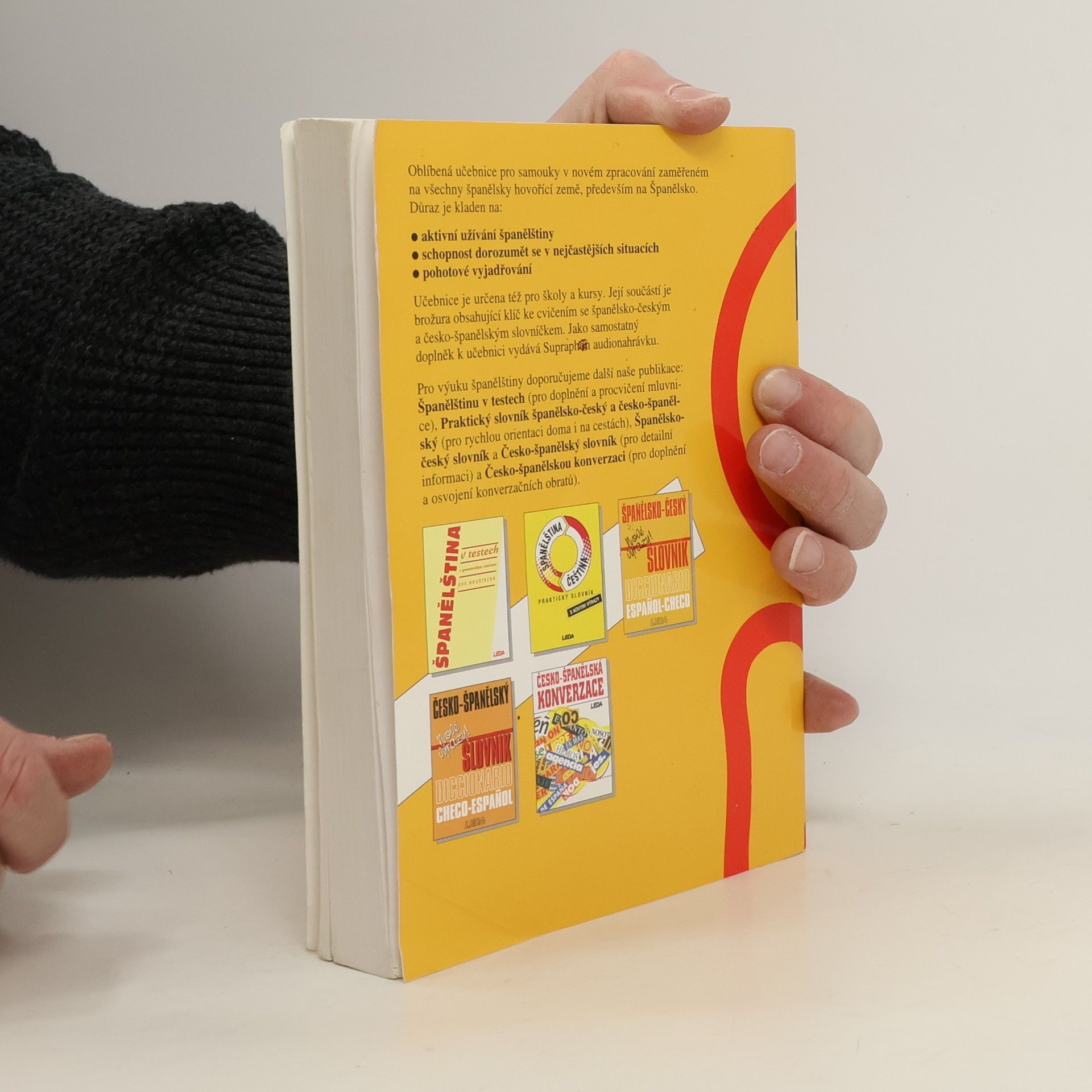Oblíbená učebnice pro samouky v novém zpracování zaměřené na všechny španělsky hovořící země, především na Španělsko. Důraz je kladen na: . aktivní užívání španělštiny . schopnost dorozumět se v nejčastějších situacích . pohotové vyjadřování Učebnice je určena též pro školy a kursy. Její součástí je brožura obsahující klíč ke cvičením (119 s.) se španělsko-českým a česko-španělským slovníčkem. Jako samostatný doplněk k učebnici vydává Supraphon audionahrávku.
