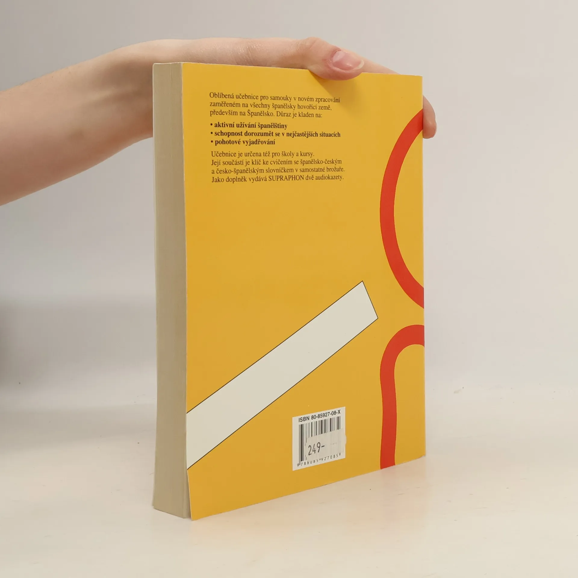 Oblíbená učebnice pro samouky v novém zpracování zaměřené na všechny španělsky hovořící země, především na Španělsko. Důraz je kladen na: . aktivní užívání španělštiny . schopnost dorozumět se v nejčastějších situacích . pohotové vyjadřování Učebnice je určena též pro školy a kursy. Její součástí je brožura obsahující klíč ke cvičením (119 s.) se španělsko-českým a česko-španělským slovníčkem. Jako samostatný doplněk k učebnici vydává Supraphon audionahrávku.