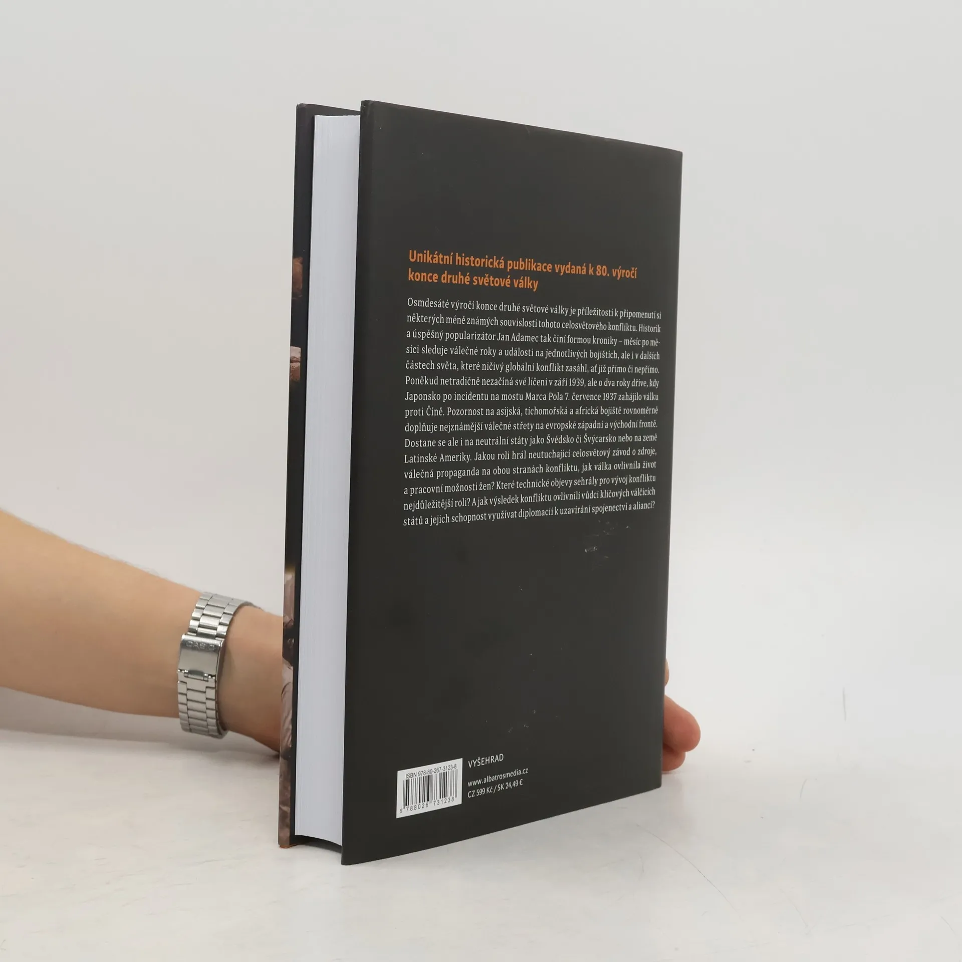 Výročí osmdesáti let od konce druhé světové války je příležitostí k připomenutí si některých méně známých souvislostí tohoto celosvětového konfliktu. Historik a úspěšný popularizátor Jan Adamec tak činí formou kroniky – měsíc po měsíci sleduje válečné roky a události na jednotlivých bojištích, ale i v dalších částech světa, které ničivý globální konflikt zasáhl. Poněkud netradičně nezačíná své líčení v září 1939, ale o dva roky dříve, kdy Japonsko po incidentu na mostu Marca Pola 7. července 1937 zahájilo válku proti Číně. Pozornost na asijská, tichomořská a africká bojiště rovnoměrně doplňuje nejznámější válečné střety na evropské západní a východní frontě. Kromě samotných válečných akcí se bohatě dostává i na diplomacii, která ani v době válečného konfliktu samozřejmě neustala. Poutavá kniha dává nahlédnout do mnoha méně známých souvislostí druhé světové války.
