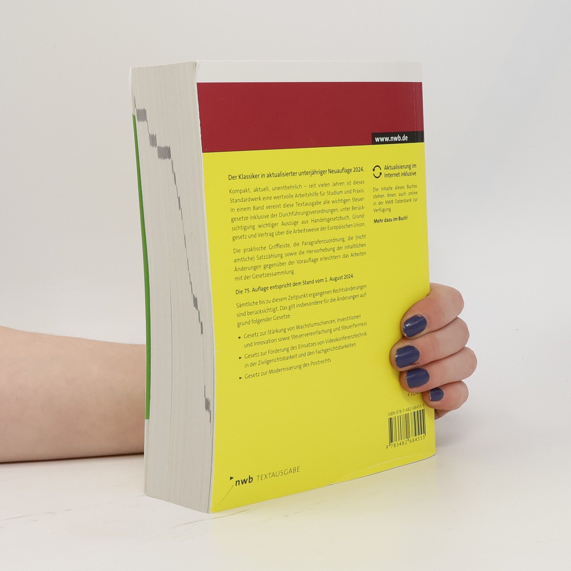 Dieses Standardwerk bietet eine kompakte und aktuelle Sammlung aller wichtigen Steuergesetze und relevanter Vorschriften in einem Band. Die 74. Auflage 2024 berücksichtigt alle Rechtsänderungen bis zum 1. Januar 2024 und ist eine unverzichtbare Hilfe für Studium und Praxis, ergänzt durch praktische Arbeitsmittel.