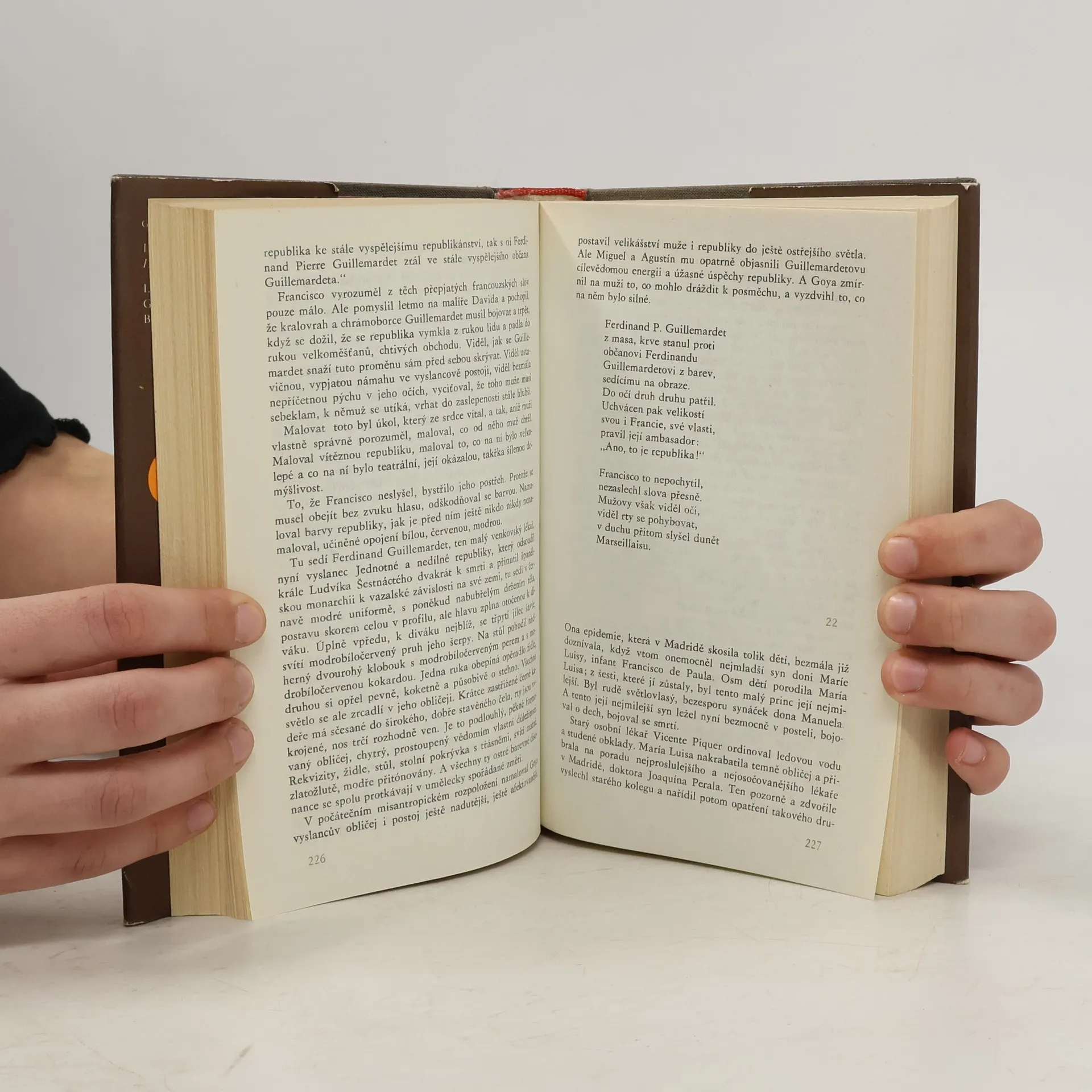 Postava Goyi v něm vystupuje jako na tapiserii, obklopená tisícem barev historických událostí. Kromě malíře zobrazuje ohromující panorama osmnáctého století ve Španělsku: na jedné straně španělskou inkvizici, stále ještě zakořeněnou ve středověku, která už na královský rod nemá téměř žádný vliv. Na druhé zrození nové doby v čerstvém větru vanoucím přes hranice z Francie, rozvoj měšťanstva, obchodníků, politických stratégů. A uprostřed všeho král Carlos, posedlý zájmem o hodinky, prostoduchý monarcha, kterého před napácháním ještě větších škod chrání nejen pohodlná povaha, ale i politika jeho chytré, života lačné manželky…