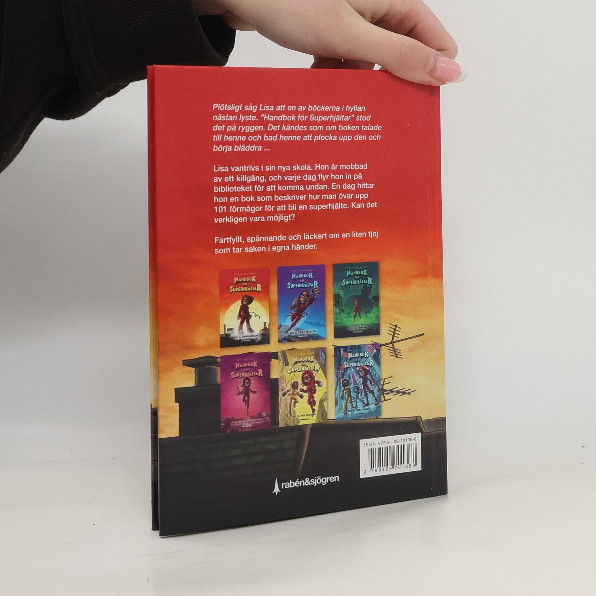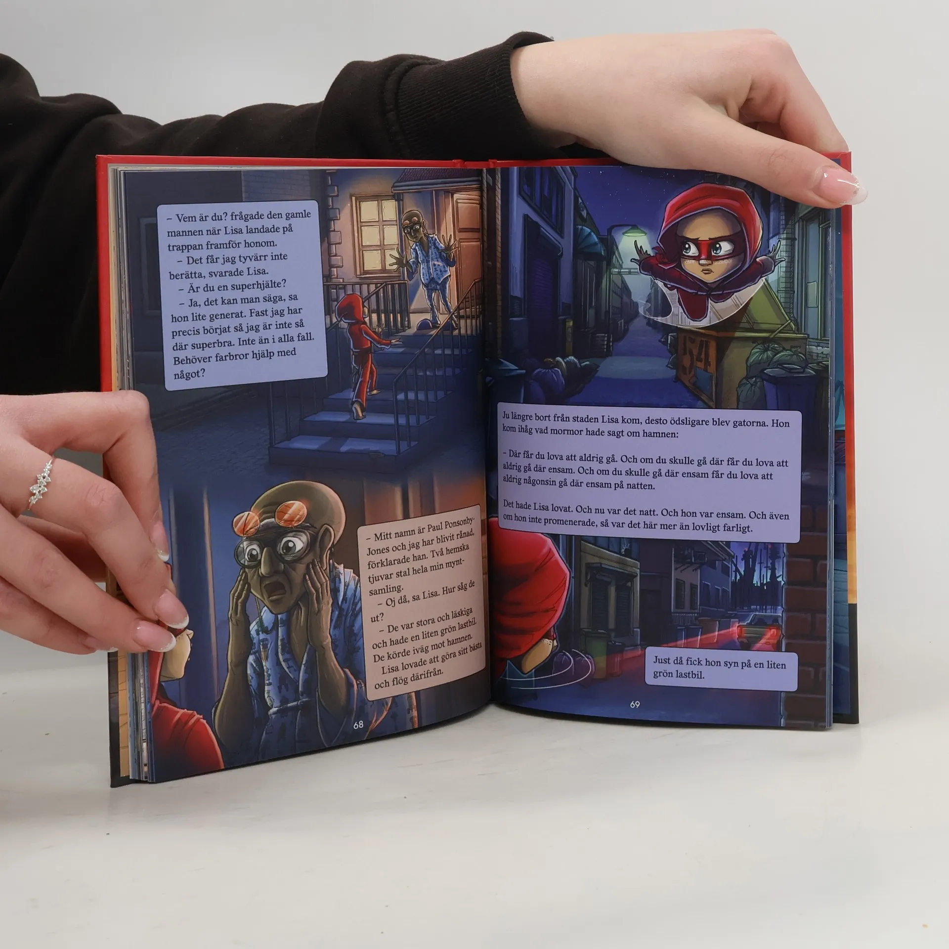 Lisa måste bo hos sin mormor i några månader eftersom hennes mamma jobbar i en annan stad. Problemet är bara att Lisa vantrivs något fruktansvärt i sin nya skola. Killgänget retar henne konstant för hennes utstående öron, och varje kväll somnar Lisa med händerna tryckta mot öronen, för att de förhoppningsvis ska sluta stå ut så mycket. En dag när Lisa, i vanlig ordning, blir jagad av killgänget rymmer hon in på biblioteket. Där, längst ner på en hylla, står en bok som liksom lyser. Lisa dras till hyllan och får fram boken som har det besynnerliga namnet "Handbok för superhjältar". Märkligt nog är inte boken registrerad i bibliotekets system, och bibliotekarien viskar till Lisa att det nog är så att handboken helt enkelt ska följa med Lisa hem och stanna där. Och i det ögonblicket börjar Lisas resa mot att bli superhjälten Röda masken! Fartfyllt, spännande och läckert om en liten tjej som tar saken i egna händer. Ett slags modern Pippi Långstrump med superkrafter som skildras med fantastiska illustrationer. Ett äventyr som man slukar, med en hjältinna som man bara måste älska!