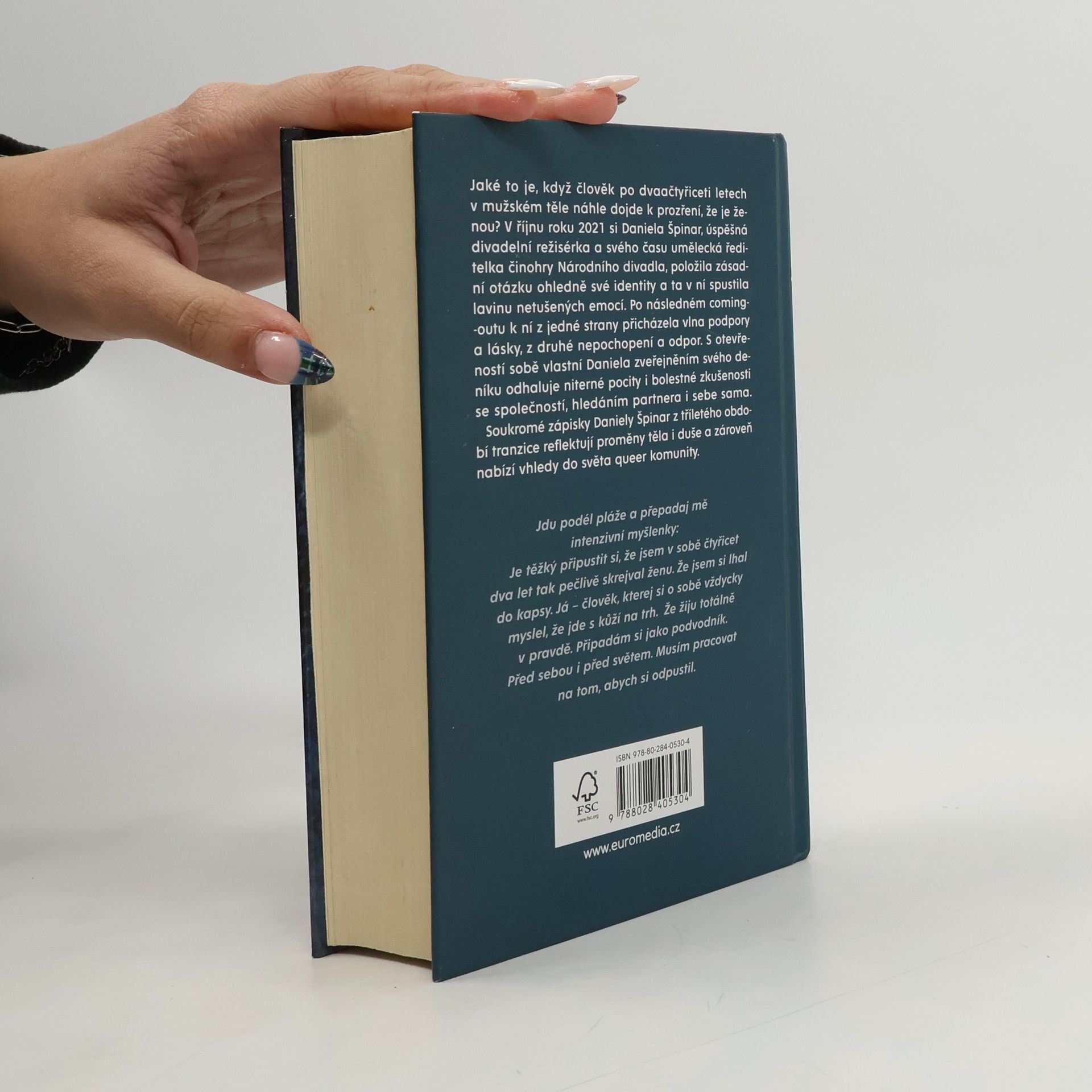 Jaké to je, když člověk po dvaačtyřiceti letech v mužském těle náhle dojde k prozření, že je ženou? V říjnu roku 2021 si Daniela Špinar, úspěšná divadelní režisérka a svého času umělecká ředitelka činohry Národního divadla, položila zásadní otázku ohledně své identity a ta v ní spustila lavinu netušených emocí. Po následném coming-outu k ní z jedné strany přicházela vlna podpory a lásky, z druhé nepochopení a odpor. S otevřeností sobě vlastní Daniela zveřejněním svého deníku odhaluje niterné pocity i bolestné zkušenosti se společností, hledáním partnera i sebe sama. Soukromé zápisky Daniely Špinar ze tříletého období tranzice reflektují proměny těla i duše a zároveň nabízí vhledy do světa queer komunity.