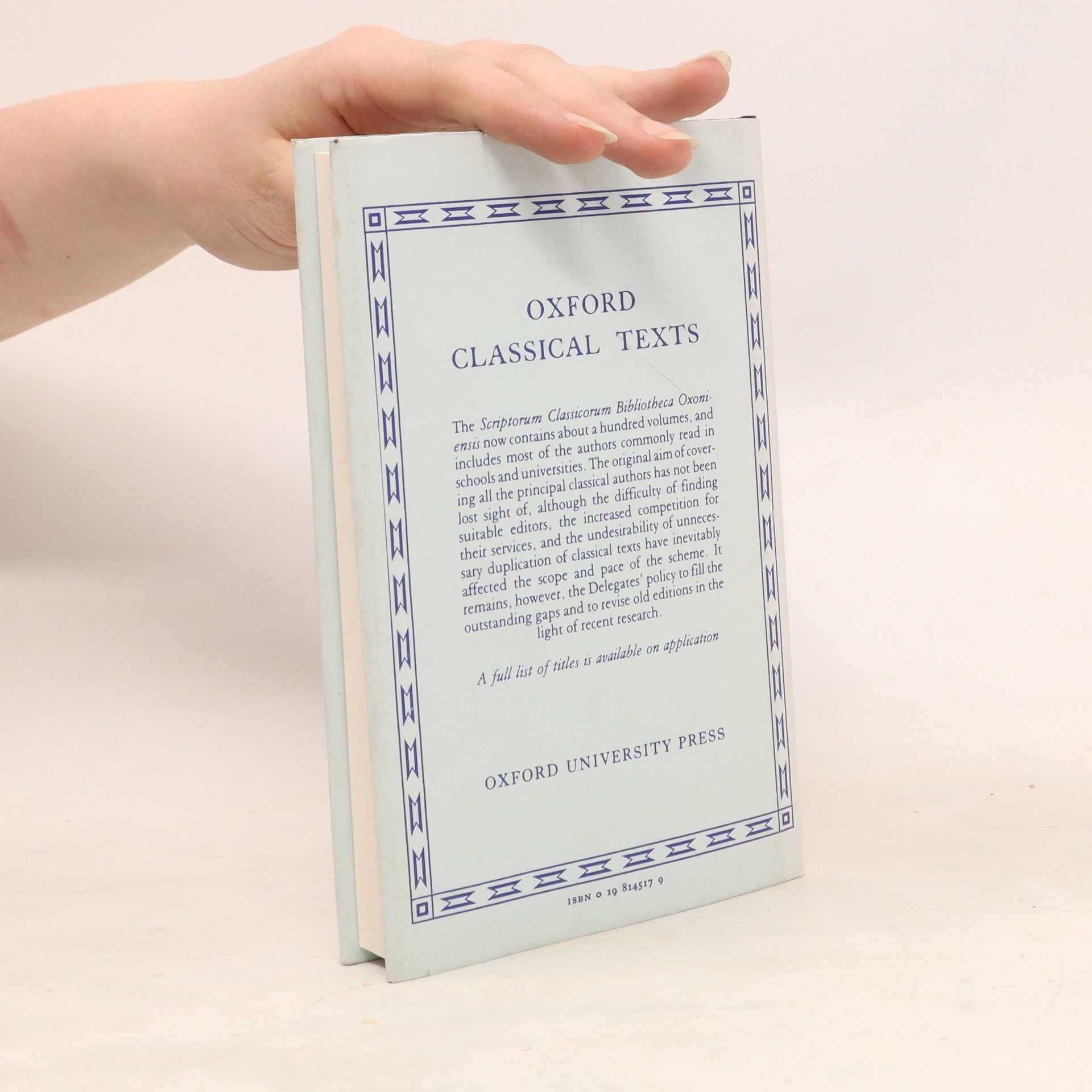 The Oxford Classical Texts, or Scriptorum Classicorum Bibliotheca Oxoniensis, are renowned for their reliability and presentation. The series consists of a text without commentary but with a brief apparatus criticus at the foot of each page. There are now over l00 volumes, representing the greater part of classical Greek and Latin literature.