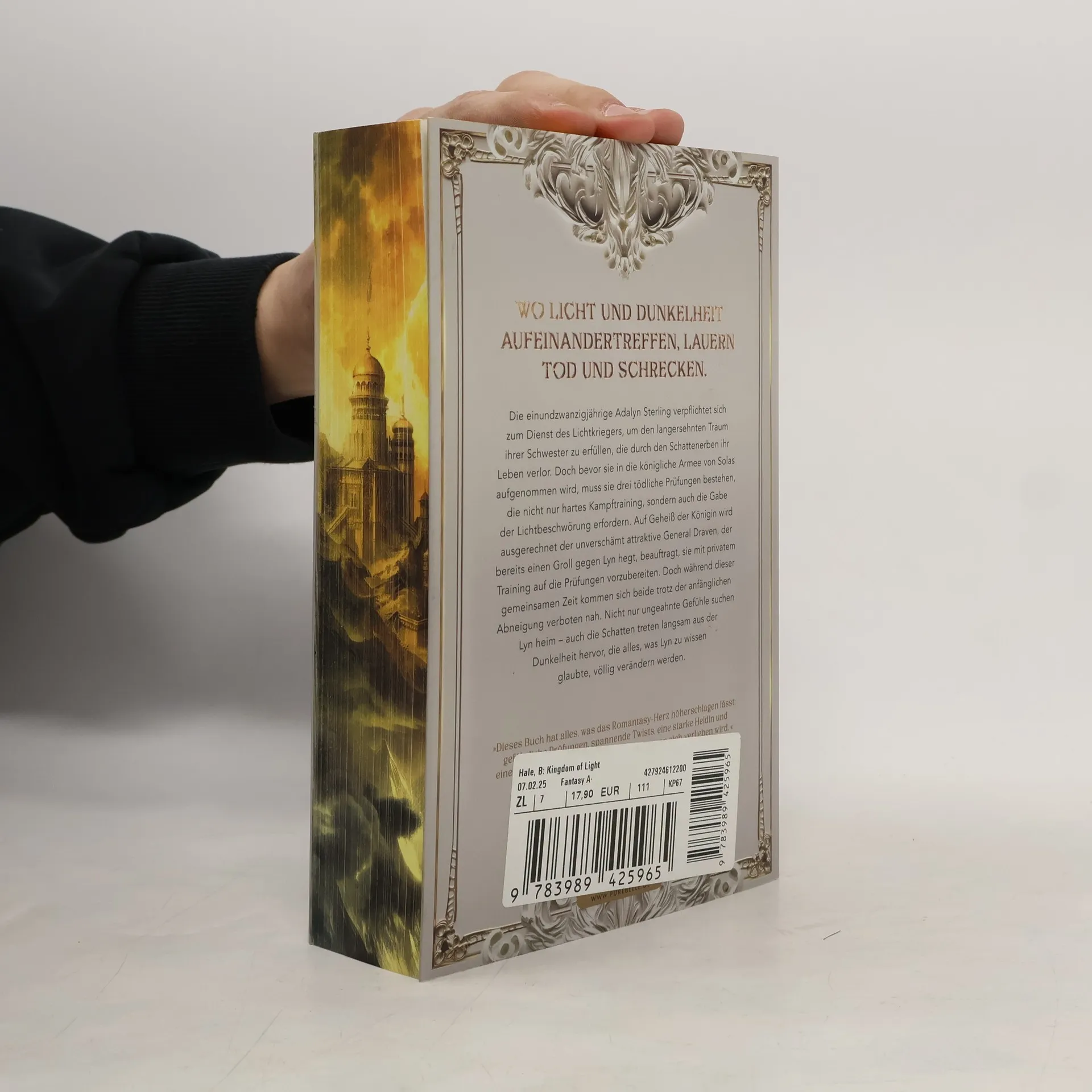 »Wo Licht und Dunkelheit aufeinandertreffen, lauern Tod und Schrecken.«Die einundzwanzigjährige Adalyn Sterling verpflichtet sich zum Dienst des Lichtkriegers, um den langersehnten Traum ihrer Schwester zu erfüllen, die durch den Schattenerben ihr Leben verlor. Doch bevor sie in die königliche Armee von Solas aufgenommen wird, muss sie drei tödliche Prüfungen bestehen, die nicht nur hartes Kampftraining, sondern auch die Gabe der Lichtbeschwörung erfordern. Auf Geheiß der Königin wird ausgerechnet der unverschämt attraktive General Draven, der bereits einen Groll gegen Lyn hegt, beauftragt, sie mit privatem Training auf die Prüfungen vorzubereiten. Doch während dieser gemeinsamen Zeit kommen sich beide trotz der anfänglichen Abneigung verboten nah. Nicht nur ungeahnte Gefühle suchen Lyn heim – auch die Schatten treten langsam aus der Dunkelheit hervor, die alles, was Lyn zu wissen glaubte, völlig verändern werden.