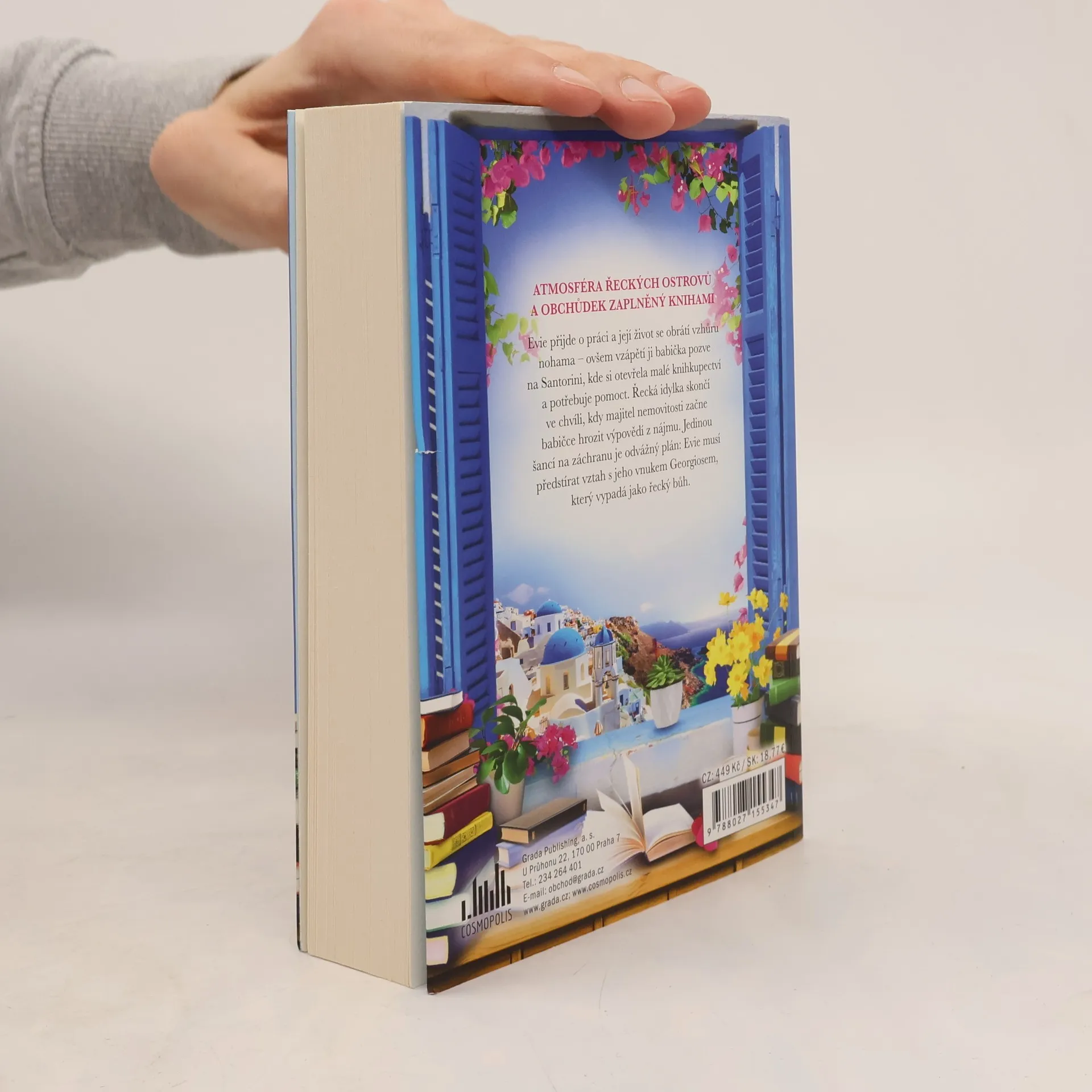 Prázdniny na řeckém ostrově. Pakt o falešném randění. Šance na pravou lásku? Po ztrátě práce jako knihovní scout potřebuje beznadějná romantik Evie nový začátek. Když se dozví, že její výstřední babička převzala malou knihkupectví na Santorini, neváhá a vyrazí ji navštívit. Život na ostrově však není tak idylický, jak se zdá. Babička má bouřlivý vztah se svým pronajímatelem, který jí hrozí, že jí knihkupectví vezme. Když se babička rozhodne požádat Evie, aby předstírala románek s vnukem pronajímatele, řeckým bohem Georgiosem, aby si zajistila jeho přízeň, Evie váhavě souhlasí. Jak slunce zapadá nad Evienými řeckými prázdninami, dokáže zachránit knihkupectví a najít lásku?