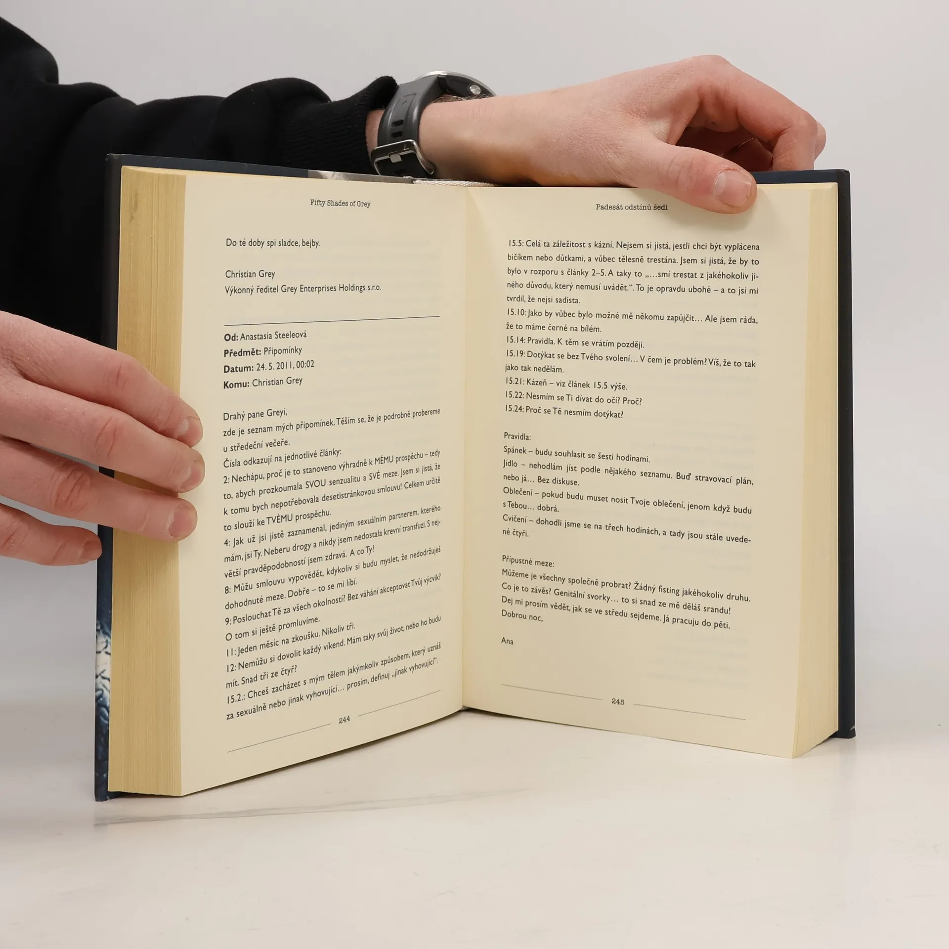 Erotický román o temných touhách v každém z nás… Když se dvaadvacetiletá studentka literatury Anastasia vydává na pohovor s mladým podnikatelem Christianem Greyem, netuší, že potká muže, který jí změní život i hodnoty. Christian je pohledný, chytrý a… tajemný. Naivní a nevinná Anastasia si začíná uvědomovat, že přes jeho skrývaná tajemství jím začíná být úplně posedlá. Ale ani Christian není vůči její kráse, šarmu a charakteru imunní a připouští, že on po ní také touží – ovšem za vlastních, specifických podmínek…