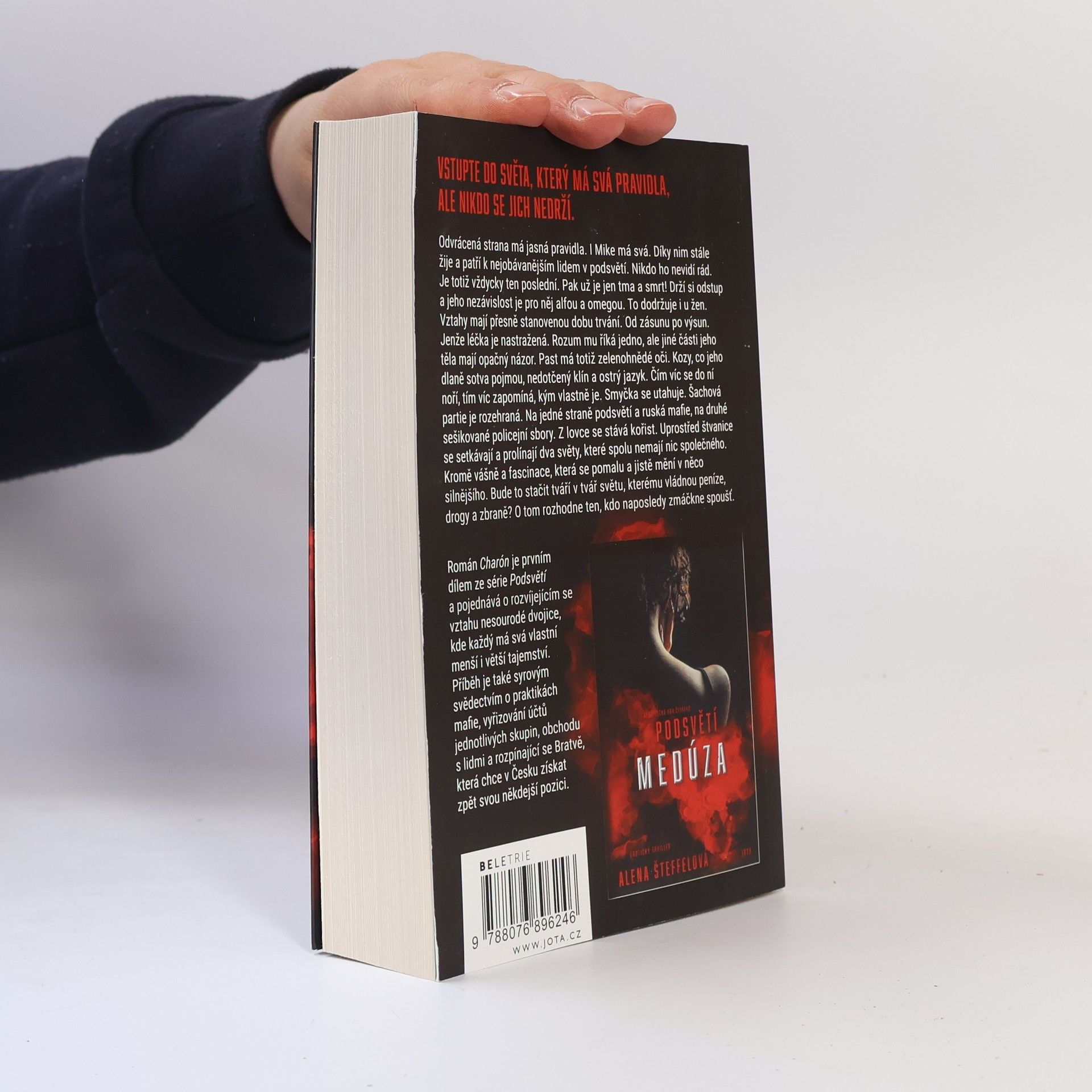 Když si zahráváš s ohněm, můžeš se spálit.Odvrácená strana má jasná pravidla. I Mike má svá. Díky nim stále žije a patří k nejobávanějším lidem v podsvětí. Nikdo ho nevidí rád. Je totiž vždycky ten poslední. Pak už je jen tma a smrt! Drží si odstup a jeho nezávislost je pro něj alfou a omegou. To dodržuje i u žen. Vztahy mají přesně stanovenou dobu trvání. Od zásunu po výsun. Jenže léčka je nastražená. Rozum mu říká jedno, ale jiné části jeho těla mají opačný názor. Past má totiž zelenohnědé oči. Kozy, co jeho dlaně sotva pojmou, nedotčený klín a ostrý jazyk. Čím víc se do ní noří, tím víc zapomíná, kým vlastně je.Smyčka se utahuje. Šachová partie je rozehraná. Na jedné straně podsvětí a ruská mafie, na druhé sešikované policejní sbory. Z lovce se stává kořist. Uprostřed štvanice se setkávají a prolínají dva světy, které spolu nemají nic společného. Kromě vášně a fascinace, která se pomalu a jistě mění v něco silnějšího. Bude to stačit tváří v tvář světu, kterému vládnou peníze, drogy a zbraně? O tom rozhodne ten, kdo naposledy zmáčkne spoušť.Román Charón je první díl série erotických thrillerů z českého podsvětí o rozvíjejícím se vztahu nesourodé dvojice, kde každý má svá menší i větší tajemství. Charón je drsné svědectví o praktikách podsvětí v Česku; syrové vyprávění se strhujícím dějem, nečekanými zápletkami a sarkasmem na každé stránce.Vstupte do světa, který má svá pravidla, ale nikdo se jich nedrží. Vstupte do Podsvětí.