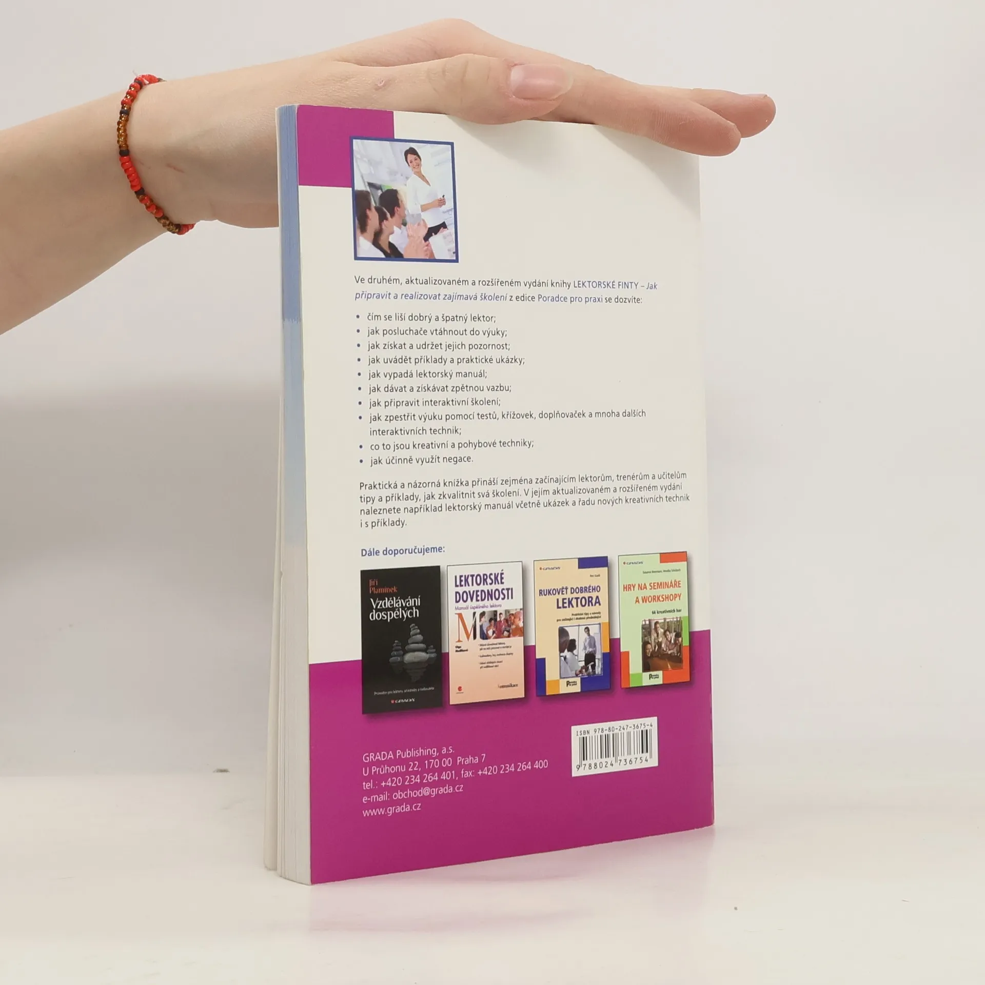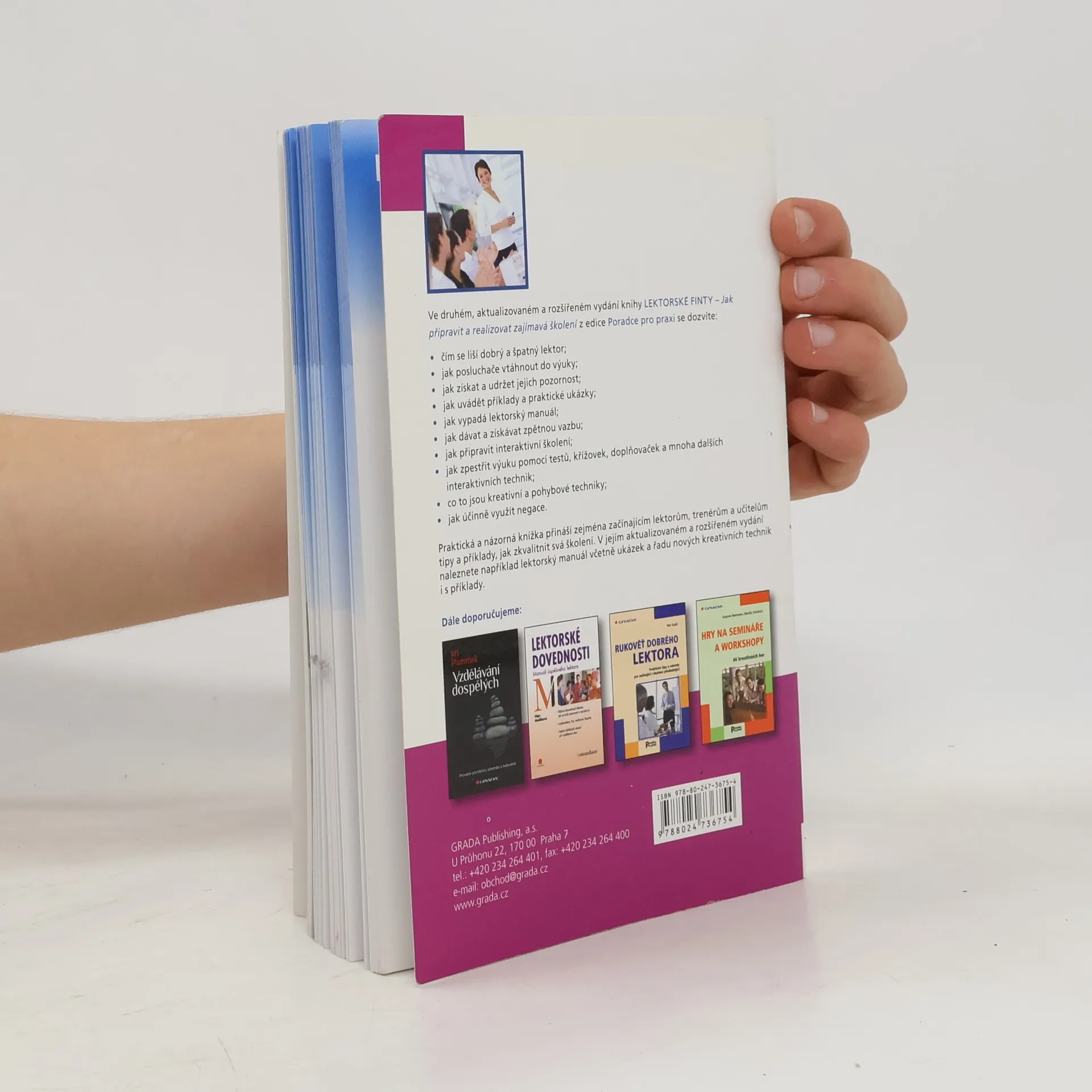 Praktická a názorná knížka přináší zejména začínajícím lektorům, trenérům a učitelům tipy a příklady, jak zkvalitnit svá školení. V rozšířeném vydání příručky naleznete například lektorský manuál včetně jeho ukázek a řadu nových kreativních technik a jejich příkladů. Dále se dozvíte se, čím se liší dobrý a špatný lektor, jak posluchače vtáhnout do výuky, jak získat a udržet jejich pozornost, jak uvádět příklady a dávat zpětnou vazbu. Hlavní pozornost je věnována interaktivitě při výuce, které se řada lektorů stále brání. Autorka na ukázkách představuje hlavní interaktivní techniky - testy, křížovky, kvízy, kreativní a pohybové techniky, využití negace a další.