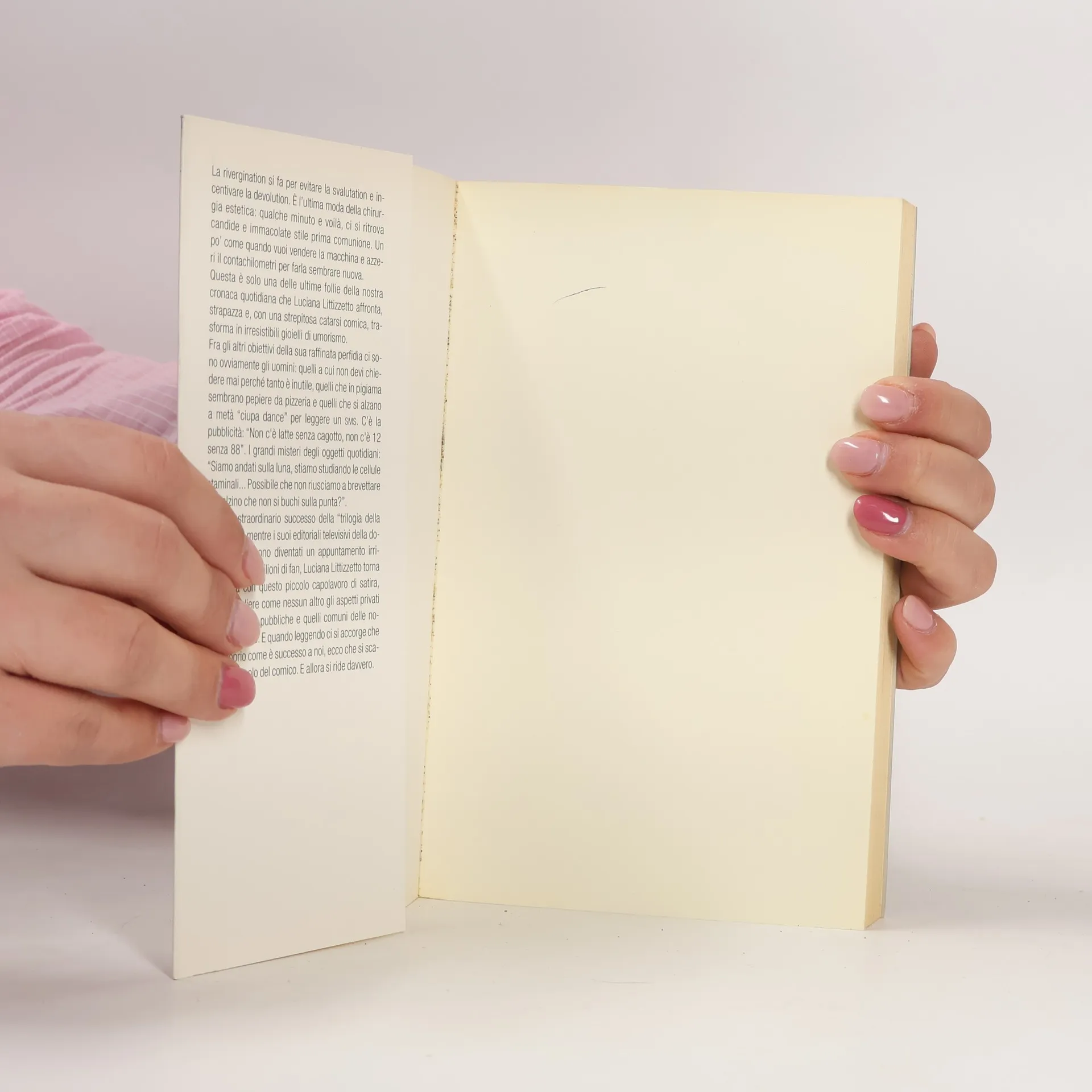 La rivergination si fa per evitare la svalutation e incentivare la devolution. È l'ultima moda della chirurgia estetica: qualche minuto e voilà, ci si ritrova candide e immacolate stile prima comunione. Un po' come quando vuoi vendere la macchina e azzeri il contachilometri per farla sembrare nuova. Questa è solo una delle ultime follie della nostra cronaca quotidiana che Luciana Littizzetto affronta, strapazza e, con una strepitosa catarsi comica, trasforma in irresistibili gioielli di umorismo. Un capolavoro di satira, che sa cogliere come nessun altro gli aspetti privati delle faccende pubbliche e quelli comuni delle nostre vite private.