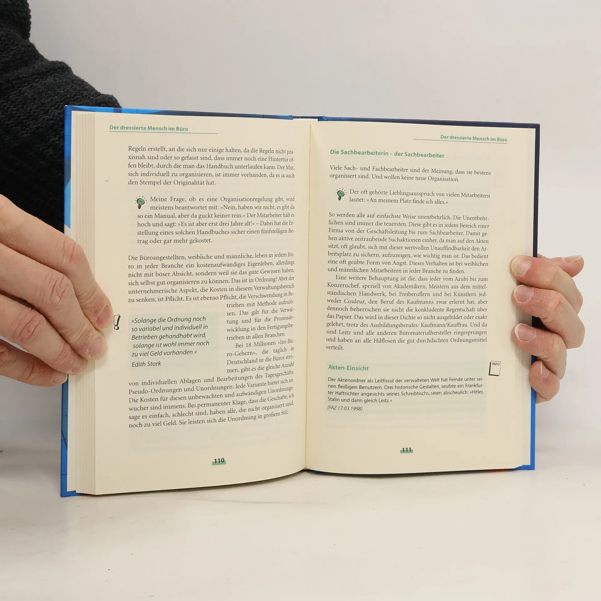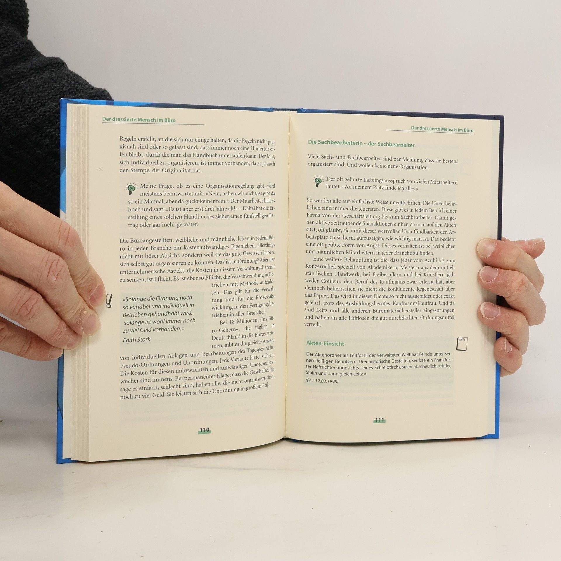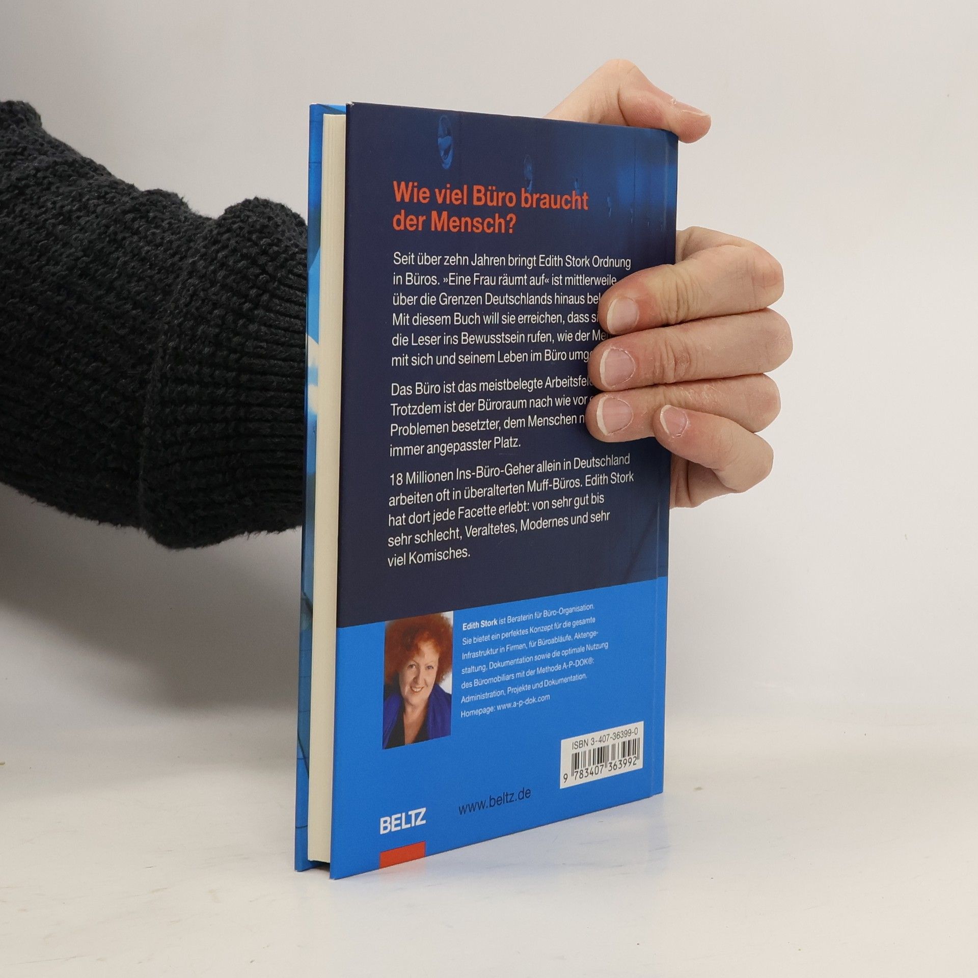 Seit über zehn Jahren bringt Edith Stork Ordnung in Büros. >Eine Frau räumt auf< ist mittlerweile über die Grenzen Deutschlands hinaus bekannt. Mit diesem Buch will sie erreichen, dass sich die Leser ins Bewusstsein rufen, wie der Mensch mit sich und seinem Leben im Büro umgeht. In den über zehn Jahren Büro-Organisation in allen Branchen hat sie immer wieder erlebt, dass es eine subtile Zurichtung gibt. Das Büro ist das meistbelegte Arbeitsfeld. Trotzdem ist der Büroraum nach wie vor ein mit Problemen besetzter, dem Menschen nicht immer angepasster Platz. 18 Millionen Ins-Büro-Geher allein in Deutschland gehen oft in überaltete Muff-Büros. Edith Stork hat dort jede Facette erlebt: Alltäglichkeit von sehr gut bis sehr schlecht, Verkrustetes, Modernes und sehr viel Komisches. Der vermeindliche Wohlfühlfaktor hat in manchen Büros skurrile Auswirkungen. >Ich hatte eine Begegnung der seltenen Art in einem Büro, da saßen und hingen in Sichttaschen und standen etwa 40 Elche im Raum und mittendrin regierte die Sachbearbeiterin, unbeirrbar und standfest wie eben ein Elch.< >Unlängst beobachtet, fand ich ein Büro voll mit Kakteen, alles stachelig übersät. Ich wagte nicht, mich zu setzen, griff aber trotzdem beim Wegschieben eines Topfes mit Kakteen in die Stacheln hinein und hatte tagelang Ministacheln, nur mit Hilfe einer Pinzette zu entfernen, in der Hand. Einfach nett!< Auf der Suche nach besseren Bürokonzepten muss sie immer wieder feststellen, dass trotz neuester Trends keine wirklich neuen Erfindungen im Bereich der kaufmännischen Abwicklung gemacht werden. Sicher fördert das Internet die Globalität. Da die Regentschaft über das Papier und die Verschlagwortung der ständig fließenden, täglichen Informationen nicht gelehrt wird, werden die Menschen zu Papierflutopfern. Die fehlende systemische Ablage und deren Wildwuchs bringt immer wieder eigenwillige Situationen hervor. >Ich kenne eine Bank, in der ein Mitarbeiter einfach alle E-Mails ausdrucken ließ, diese in einer rechtwinkligen Ecke stapelte. Als ich diesem Stapel begegnete, hatte er eine Höhe von 1,60 m. Wenn der Mitarbeiter auf Reisen ging, nahm er immer eine Handvoll ins Flugzeug mit, um sie zu lesen. Diese Bank gibt es nicht mehr, aber natürlich nicht deswegen.< >In einem Großraumbüro entdeckte ich eine Besonderheit: Mitten im Raum stand ein kleiner Tisch mit vier Ordnern alle mit gleichem Namen: Unklar A-Z. Immer, wenn jemand etwas nicht fand, erhielt er den Zuruf: >Sieh doch mal im Unklar-Ordner nach.<< Die Vision von Edith Stork ist der allgemeinen >Zurichtung entgegen zu wirken: täglich, wöchentlich, für immer. Der Aufstand lohnt sich