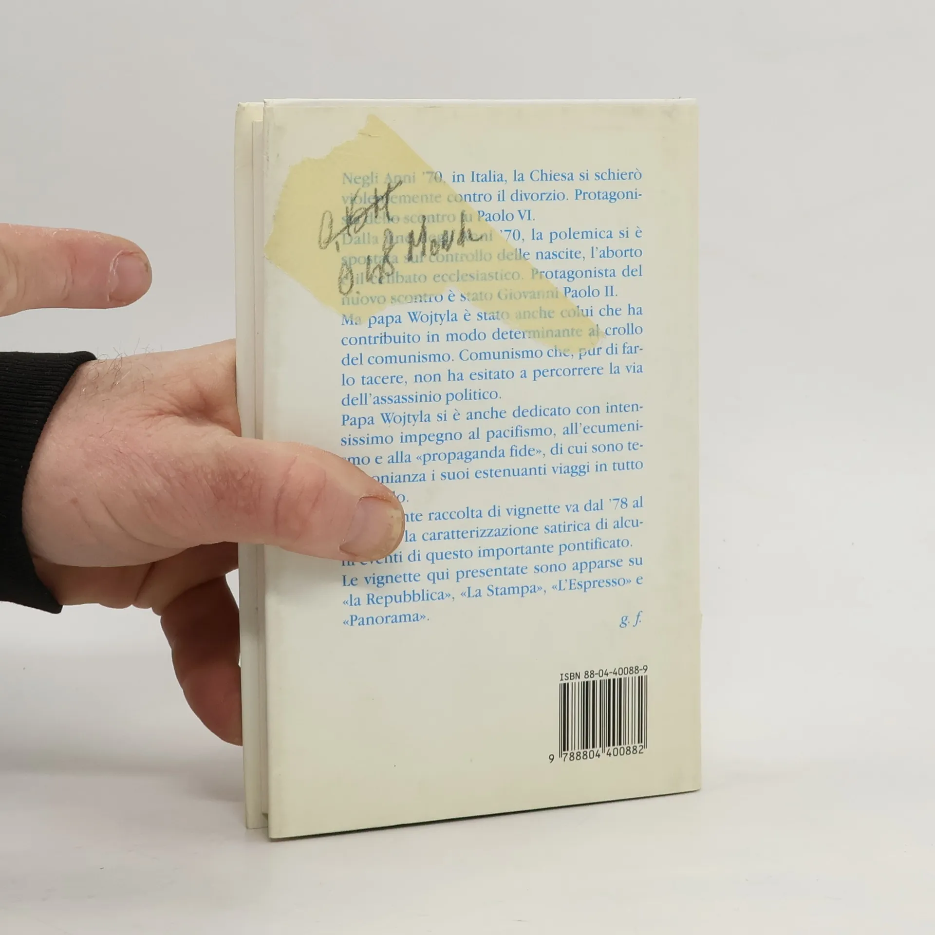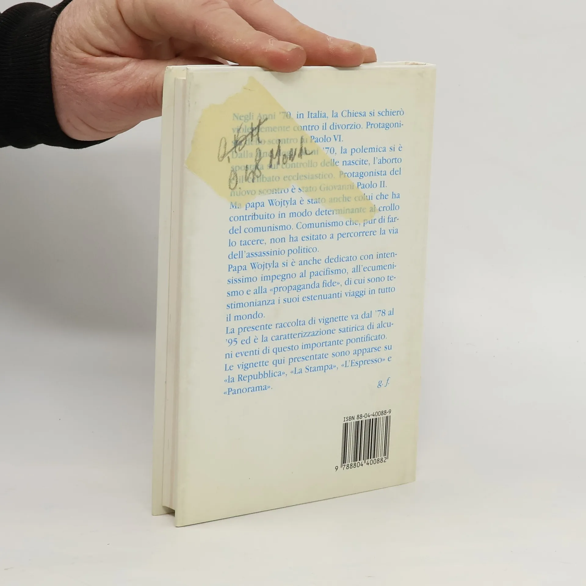 Il più importante papato del Novecento raccontato da Forattini in diciotto anni di satira. Negli Anni '70, in Italia, la Chiesa si schierò violentemente contro il divorzio. Protagoni-sta dello scontro fu Paolo VI. Dalla fine degli Anni '70, la polemica si è spostata sul controllo delle nascite, l'aborto e il celibato ecclesiastico. Protagonista del nuovo scontro è stato Giovanni Paolo II. Ma papa Wojtyla è stato anche colui che ha contribuito in modo determinante al crollo del comunismo. Comunismo che, pur di far-lo tacere, non ha esitato a percorrere la via dell'assassinio politico. Papa Wojtyla si è anche dedicato con inten-sissimo impegno al pacifismo, all'ecumeni-smo e alla «propaganda fide», di cui sono te-stimonianza i suoi estenuanti viaggi in tutto il mondo. La presente raccolta di vignette va dal '78 al '95 ed è la caratterizzazione satirica di alcu-ni eventi di questo importante pontificato. Le vignette qui presentate sono apparse su «la Repubblica», «La Stampa», «L'Espresso» e «Panorama».