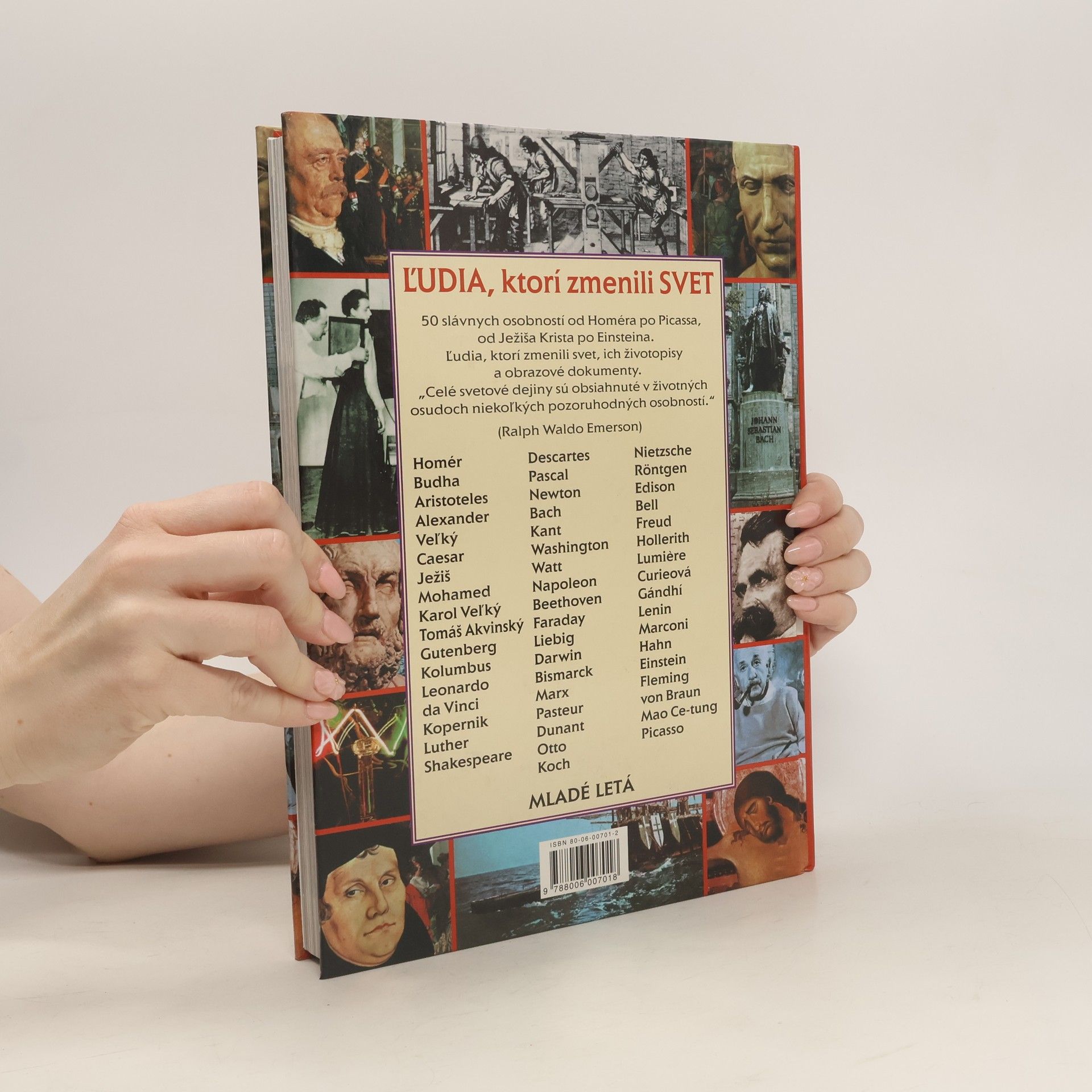 Kniha predstavuje 50 významných osobností od najstarších čias po dvadsiate storočie, ktoré rozhodujúcim spôsobom ovplyvnili svetové dejiny. Od Homéra po Picassa, od Ježiša Krista po Einsteina sa zoznámime s mnohými vedcami, vynálezcami, objaviteľmi, štátnikmi, umelcami, velikánmi hudby a výtvarného umenia. Ich životopisy a ďalšie textové materiály sú doplnené množstvom cenných obrazových dokumentov