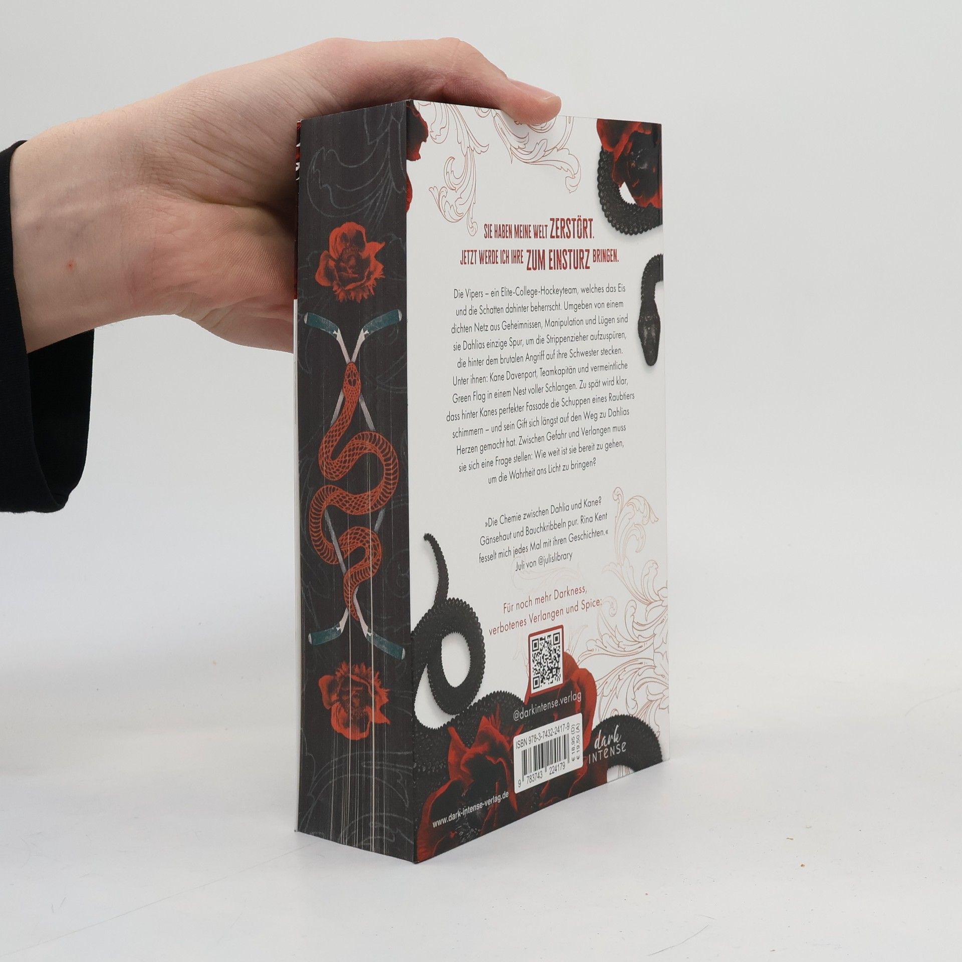 In einer Höhle voller Vipern ist Rache das tödlichste Gift. „Sie haben meine Welt zerstört und jetzt werde ich ihre zum Einsturz bringen.“ Ein Elite-College-Hockeyteam, das das Eis und die Schatten dahinter beherrscht – die Vipers sind Dahlias einzige Spur, um die Strippenzieher, die hinter ihrem Unglück stecken, aufzuspüren. Unter ihnen befindet sich Kane Davenport, eine einsame Green Flag in einem Nest voller Schlangen – und die einzige Möglichkeit, um an die Mannschaft heranzukommen. Doch zu spät wird klar, hinter seiner Fassade schimmern die giftigen Schuppen eines Raubtiers. Der Auftakt der heißbegehrten Dark-Romance-Reihe von Rina Kent und der Start in ein neues Kapitel des Renaverse! Die Infiltration einer Eishockey-Mannschaft – Rina Kents heißerwartete Dark Romance mit giftiger Rache, eiskalten Geheimnissen und leidenschaftlicher Erotik! Eishockey-Dark-Romance mit Revenge: Ein College-Team mit dunklen Geheimnissen und eine Heldin, die alles riskiert, um sie zu Fall zu bringen. Eine Undercover-Mission mit Konsequenzen: Was als kalkulierter Racheplan beginnt, wird zu einem brandgefährlichen Spiel aus Verlangen, Macht und tödlicher Anziehung. Mit edlem Farbschnitt und hochwertigem Lesezeichen in der Erstauflage - Nur solange der Vorrat reicht!