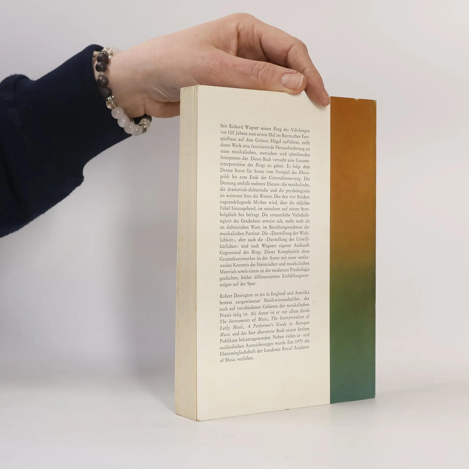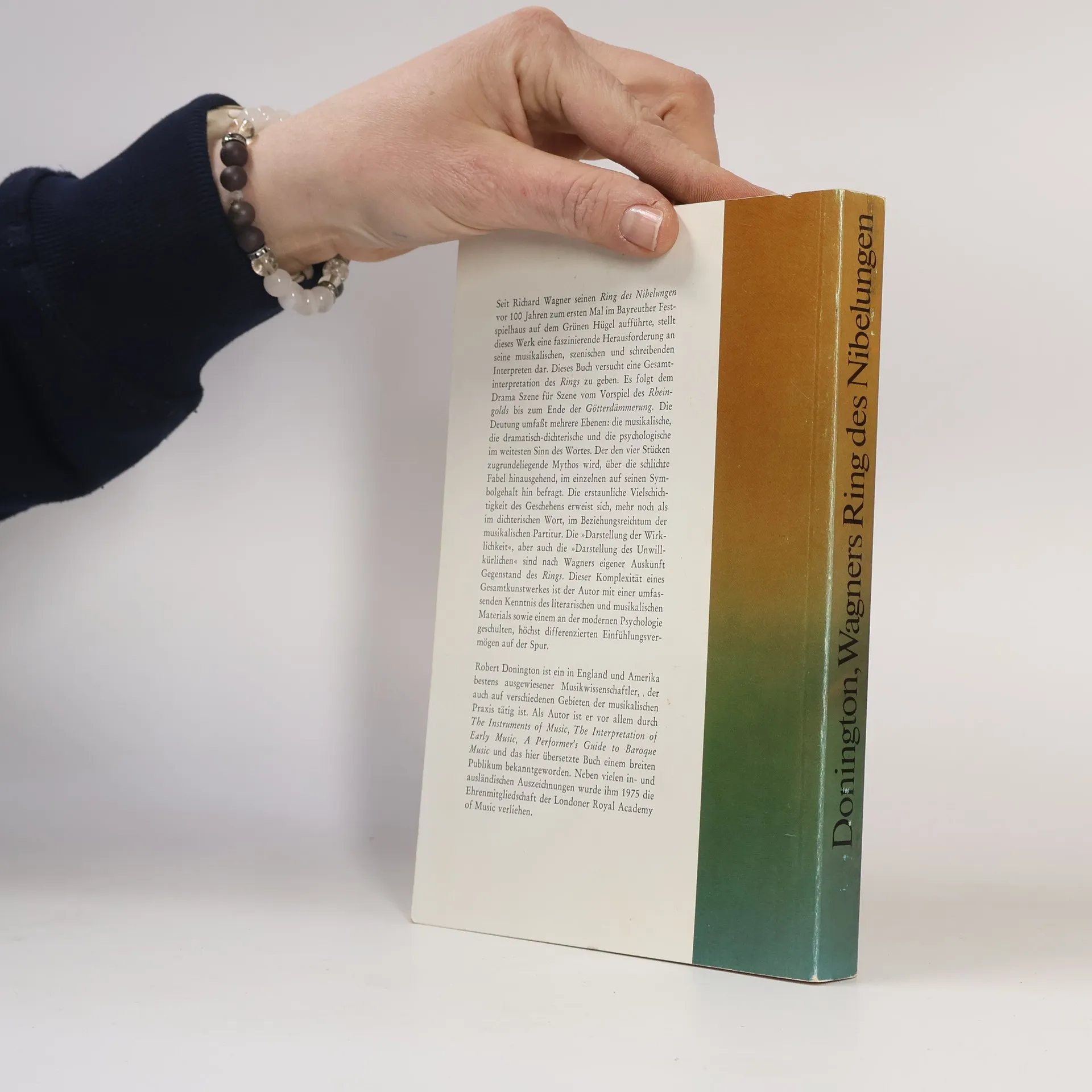 Der englische Musikwissenschaftler Robert Donington legt eine Deutung des gesamten Ring-Zyklus vor. Er folgt dem Drama Szene für Szene vom Vorspiel des Rheingolds bis zum Ende der Götterdämmerung. Die Deutung umfasst mehrere Ebenen: die musikalische, die dramatisch-dichterische und die psychologische im weitesten Sinn des Wortes. Der den vier Stücken zugrunde liegende Mythos wird im einzelnen auf seinen Symbolgehalt hin befragt. Mit einem systematischen Noten-Anhang der Motive.