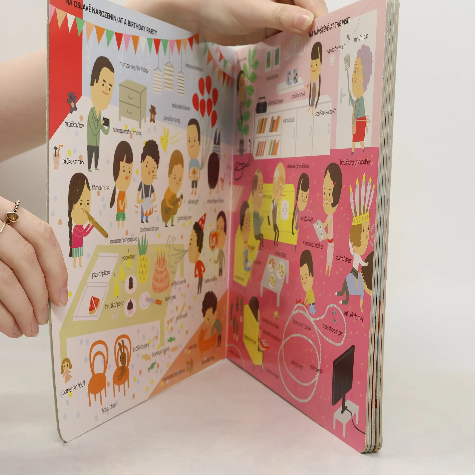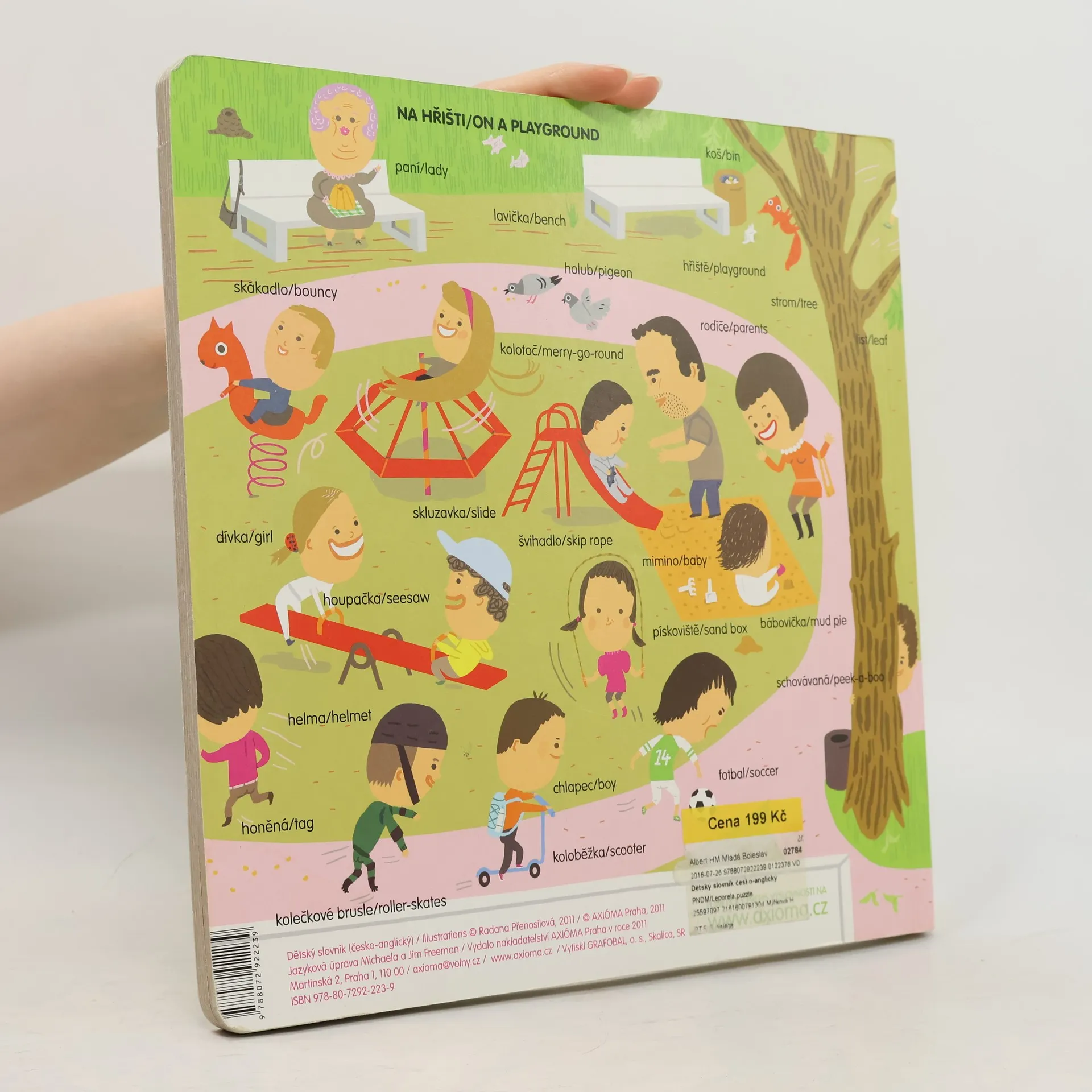 Dětský slovník česko-anglický. Obrázkový slovník seznamuje nejmenší děti s pojmenováním věcí, které se kolem nich vyskytují v různých prostředích: na hřišti, na oslavě narozenin, na návštěvě, u lékaře, na nádraží, v restauraci, v divadle, v obchodě. Každé slovo je opatřeno českým a anglickým názvem. Na našich webových stránkách je také možné si stáhnout foneticky přepis všech slov.