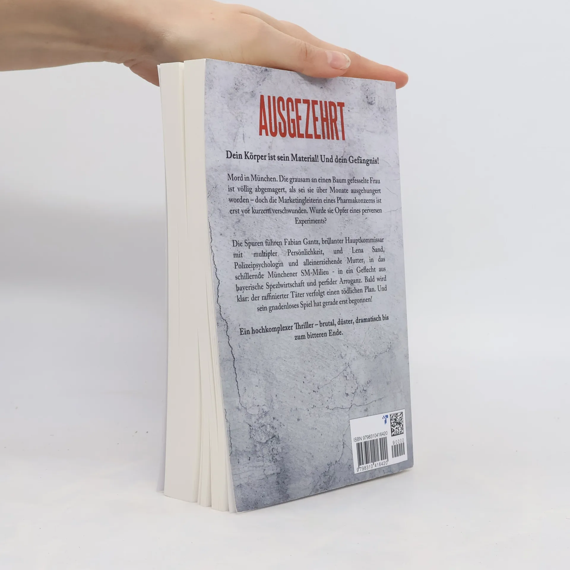 Dein Körper ist sein Material! Und dein Gefängnis! Mord in München. Die grausam an einem Baum gefesselte Frau ist völlig abgemagert, als sei sie über Monate ausgehungert worden – doch die Marketingleiterin eines Pharmakonzerns ist erst vor kurzem verschwunden. Wurde sie Opfer eines perversen Experiments? Die Spuren führen Fabian Gantz, brillanter Hauptkommissar mit multipler Persönlichkeit, und Lena Sand, Polizeipsychologin und alleinerziehende Mutter, in das schillernde Münchener SM-Milieu - in ein Geflecht aus bayerische Spezlwirtschaft und perfider Arroganz. Bald wird klar: der raffinierter Täter verfolgt einen tödlichen Plan. Und sein gnadenloses Spiel hat gerade erst begonnen! Ein hochkomplexer Thriller – brutal, düster, dramatisch bis zum bitteren Ende.