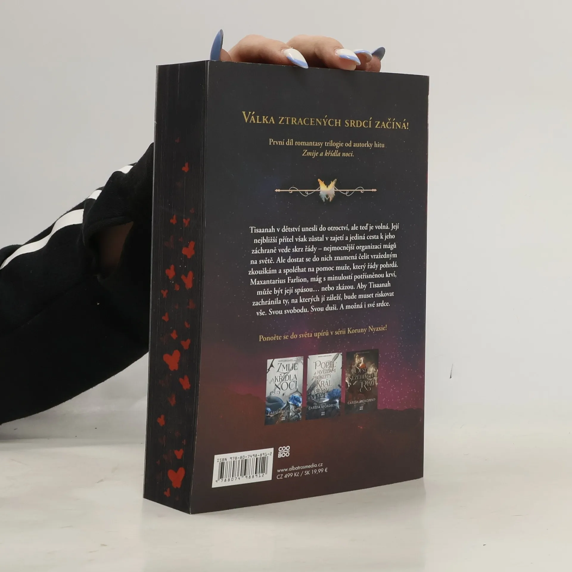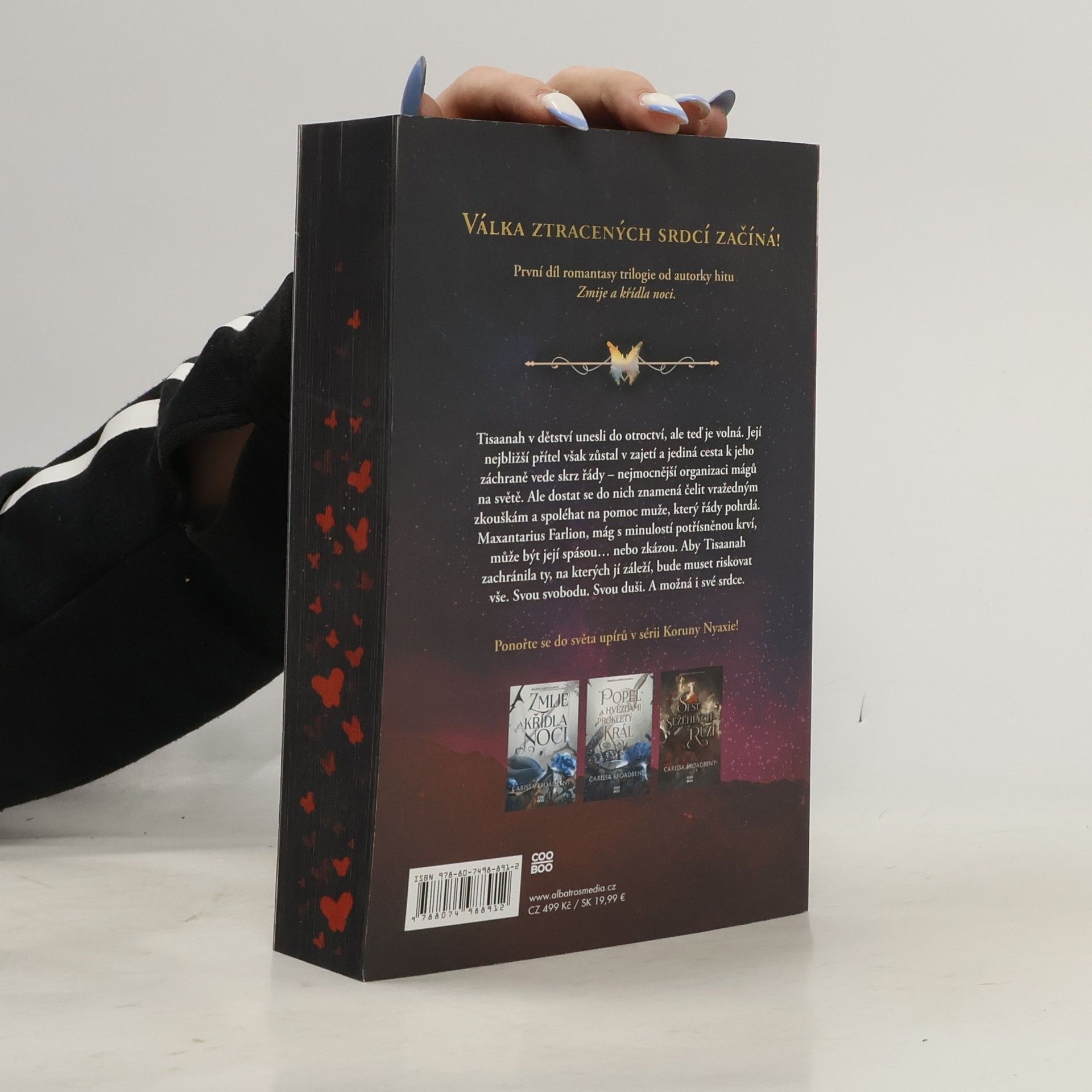 Válka ztracených srdcí začíná! První díl romantasy trilogie od autorky hitu Zmije a křídla noci. Tisaanah v dětství unesli do otroctví, ale teď je volná. Její nejbližší přítel však zůstal v zajetí a jediná cesta k jeho záchraně vede skrz řády – nejmocnější organizaci mágů na světě. Ale dostat se do nich znamená čelit vražedným zkouškám a spoléhat na pomoc muže, který řády pohrdá. Maxantarius Farlion, mág s minulostí potřísněnou krví, může být její spásou… nebo zkázou. Aby Tisaanah zachránila ty, na kterých jí záleží, bude muset riskovat vše. Svou svobodu. Svou duši. A možná i své srdce.