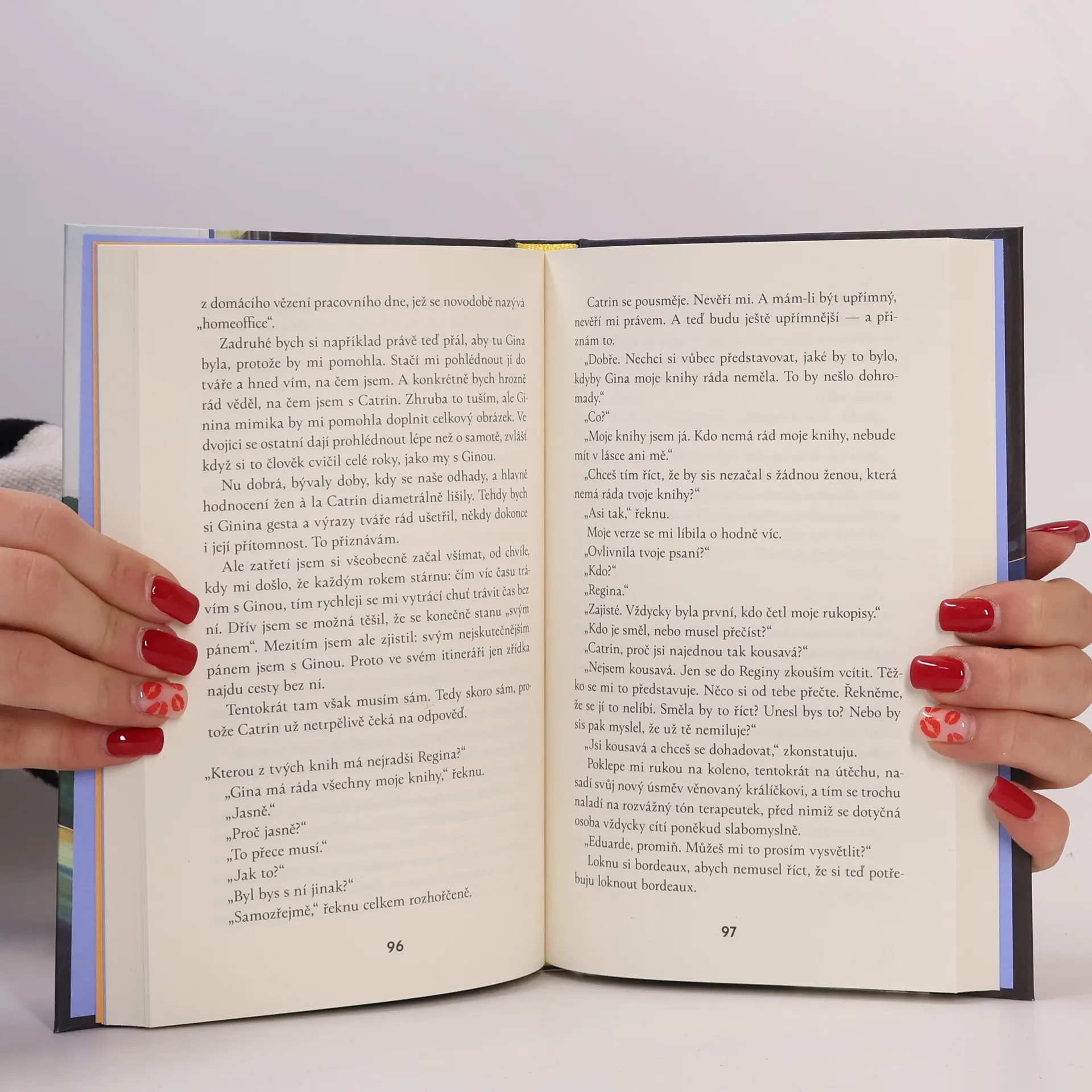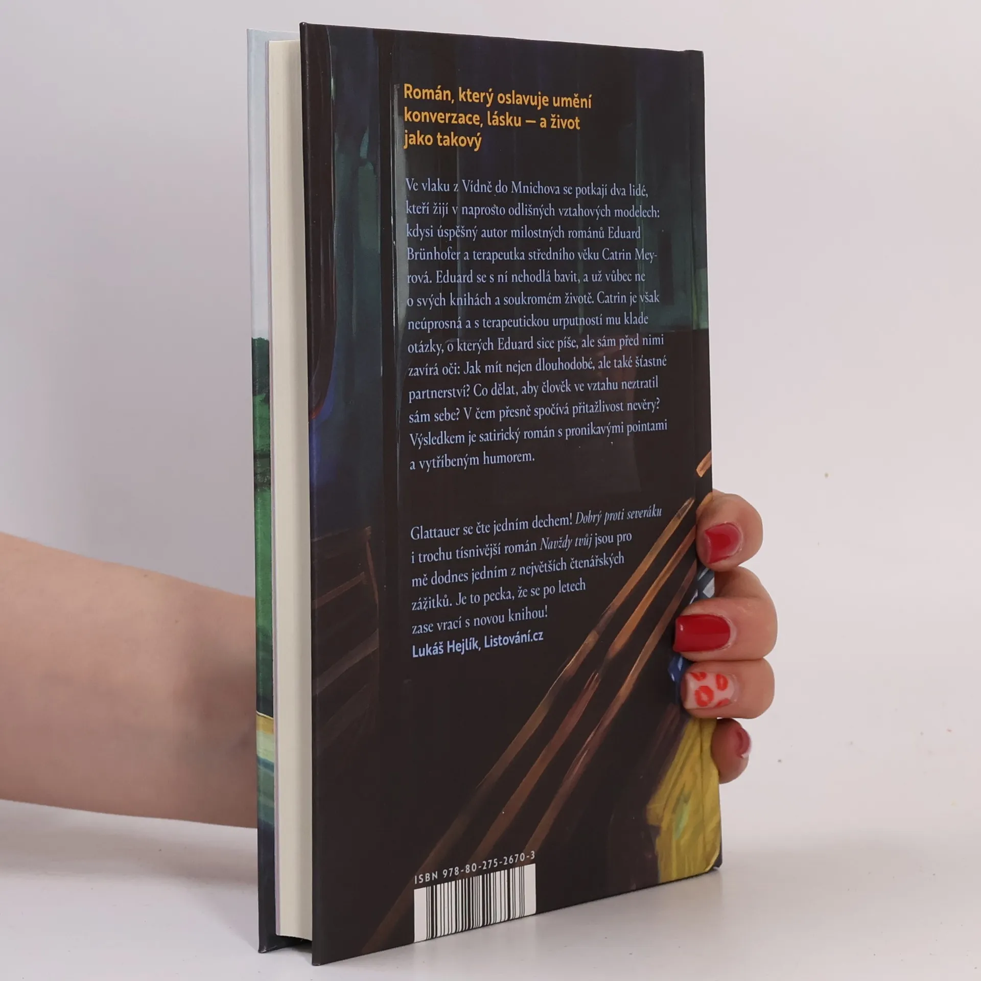 Román, který oslavuje umění konverzace, lásku — a život jako takový Ve vlaku z Vídně do Mnichova se náhodou potkají dva lidé, kteří žijí v naprosto odlišných vztahových modelech: kdysi úspěšný autor milostných románů Eduard Brünhofer a terapeutka středního věku Catrin Meyrová. Eduard se s ní nehodlá bavit, a už vůbec ne o svých knihách a milostném životě. Catrin je však neúprosná a s terapeutickou urputností mu klade otázky, o kterých Eduard sice píše, ale sám před nimi zavírá oči: Jak spolu zůstat nejen dlouho, ale také šťastní? Co dělat, aby člověk ve vztahu neztratil sám sebe? V čem přesně spočívá přitažlivost nevěry? Výsledkem je satirický román s pronikavými pointami a vytříbeným humorem.