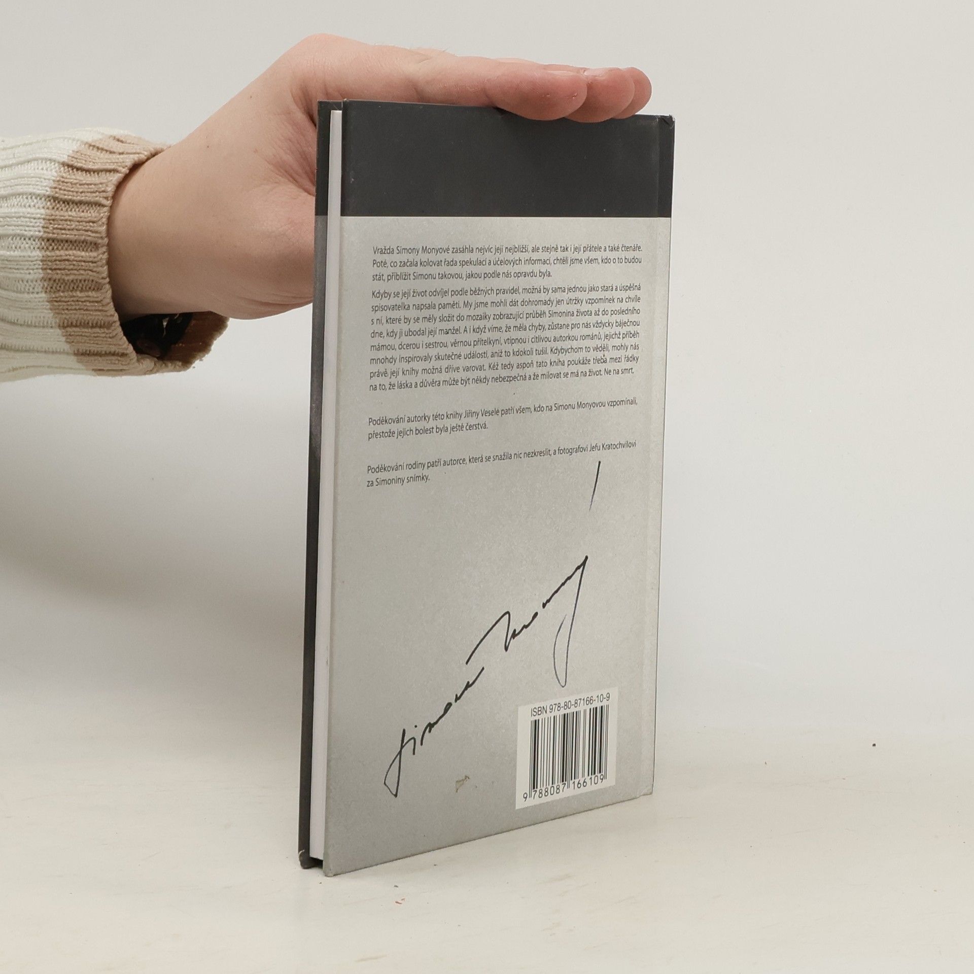 Vražda Simony Monyové zasáhla nejvíc její nejbližší, ale stejně tak i její přátele a také čtenáře. Poté, co začala kolovat řada spekulací a účelových informací, chtěli jsme všem, kdo o to budou stát, přiblížit Simonu takovou, jakou podle nás opravdu byla. Kdyby se její život odvíjel podle běžných pravidel, možná by sama jednou jako stará a úspěšná spisovatelka napsala paměti. My jsme mohli dát dohromady jen útržky vzpomínek na chvíle s ní, které by se měly složit do mozaiky zobrazující průběh Simonina života až do posledního dne, kdy ji ubodal její manžel. A i když víme, že měla chyby, zůstane pro nás vždycky báječnou mámou, dcerou i sestrou, věrnou přítelkyní, vtipnou i citlivou autorkou románů, jejichž příběh mnohdy inspirovaly skutečné události, aniž to kdokoli tušil. Kdybychom to věděli, mohly nás právě její knihy možná dříve varovat. Kéž tedy aspoň tato kniha poukáže třeba mezi řádky na to, že láska a důvěra může být někdy nebezpečná a že milovat se má na život. Ne na smrt. Poděkování autorky této knihy Jiřiny Veselé patří všem, kdo na Simonu Monyovou vzpomínali, přestože jejich bolest byla ještě čerstvá. Poděkování rodiny patří autorce, která se snažila nic nezkreslit, a fotografovi Jefu Kratochvilovi za Simoniny snímky.