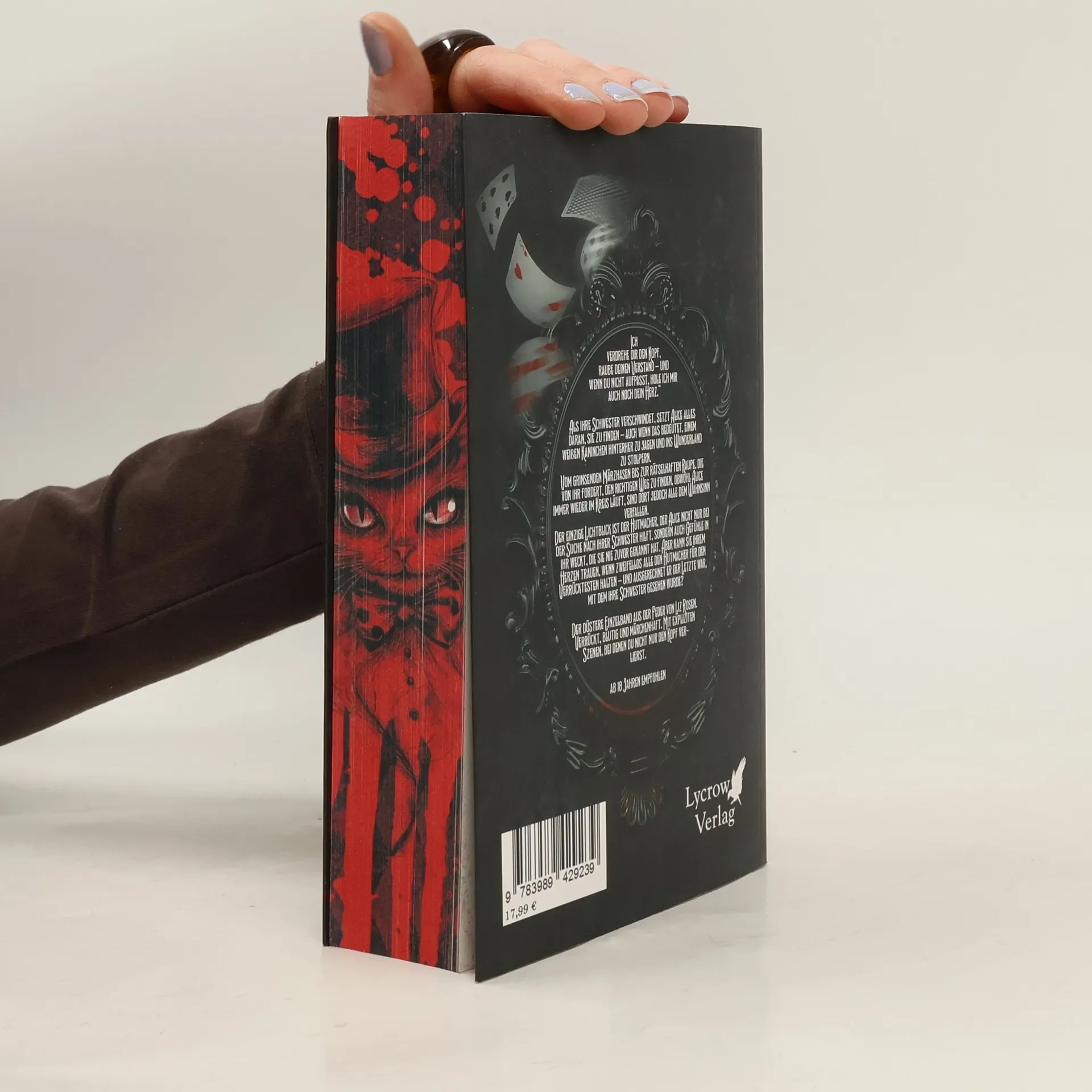 +++ Aufwendig gestaltete Ausgabe mit limitiertem Farbschnitt +++ „Ich verdrehe dir den Kopf, raube deinen Verstand – und wenn du nicht aufpasst, hole ich mir auch noch dein Herz.“ Als ihre Schwester verschwindet, setzt Alice alles daran, sie zu finden – auch wenn das bedeutet, einem weißen Kaninchen hinterher zu jagen und ins Wunderland zu stolpern. Vom grinsenden Märzhasen bis zur rätselhaften Raupe, die von ihr fordert, den richtigen Weg zu finden, obwohl Alice immer wieder im Kreis läuft, sind dort jedoch alle dem Wahnsinn verfallen. Der einzige Lichtblick ist der Hutmacher, der Alice nicht nur bei der Suche nach ihrer Schwester hilft, sondern auch Gefühle in ihr weckt, die sie nie zuvor gekannt hat. Aber kann sie ihrem Herzen trauen, wenn zweifellos alle den Hutmacher für den Verrücktesten halten – und ausgerechnet er der Letzte war, mit dem ihre Schwester gesehen wurde? Der düstere Einzelband aus der Feder von Liz Rosen. Verrückt, blutig und märchenhaft. Mit expliziten Szenen, bei denen du nicht nur den Kopf verlierst.