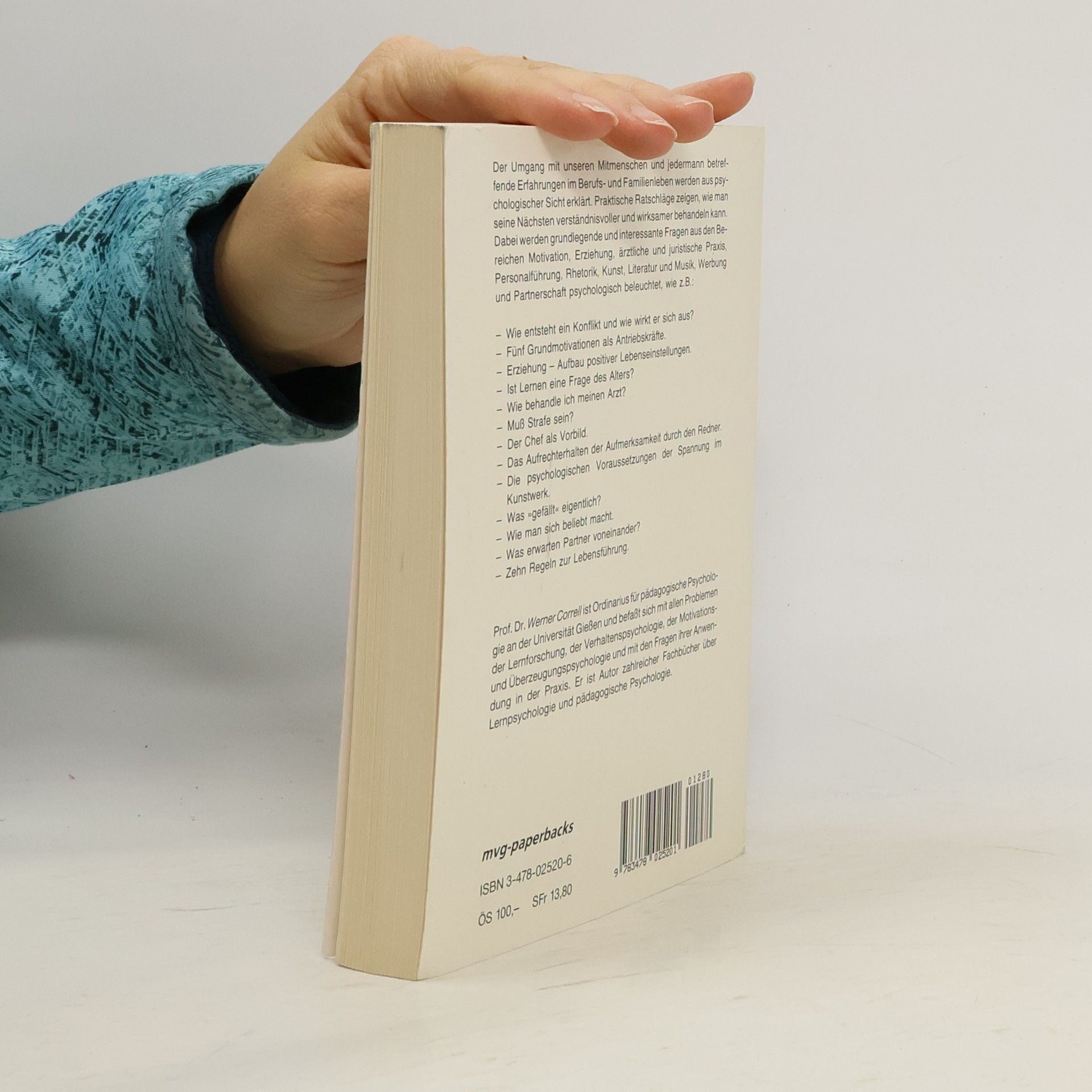 Die Kunst mit Menschen richtig umzugehen Für den beruflichen Erfolg und auch für persönliche Beziehungen ist es sehr wichtig, andere Menschen richtig zu verstehen. Werner Correll erklärt die häufigsten Erfahrungen mit anderen im Berufs- und Familienleben aus psychologischer Sicht. Praktische Ratschläge zeigen, wie man seine Nächsten verständnisvoller und wirksamer behandeln kann. Dabei werden grundlegende und interessante Fragen aus den Bereichen Motivation, Erziehung, ärztliche und juristische Praxis, Personalführung, Rhetorik, Partnerschaft u. a. psychologisch beleuchtet: Wie entsteht ein Konflikt und wie wirkt er sich aus? Die fünf Grundmotivationen als Antriebskräfte. Erziehung: Aufbau positiver Lebenseinstellungen. Was erwarten Partner voneinander? Wie fördert man durch die richtige Erziehung eine positive Lebenseinstellung?