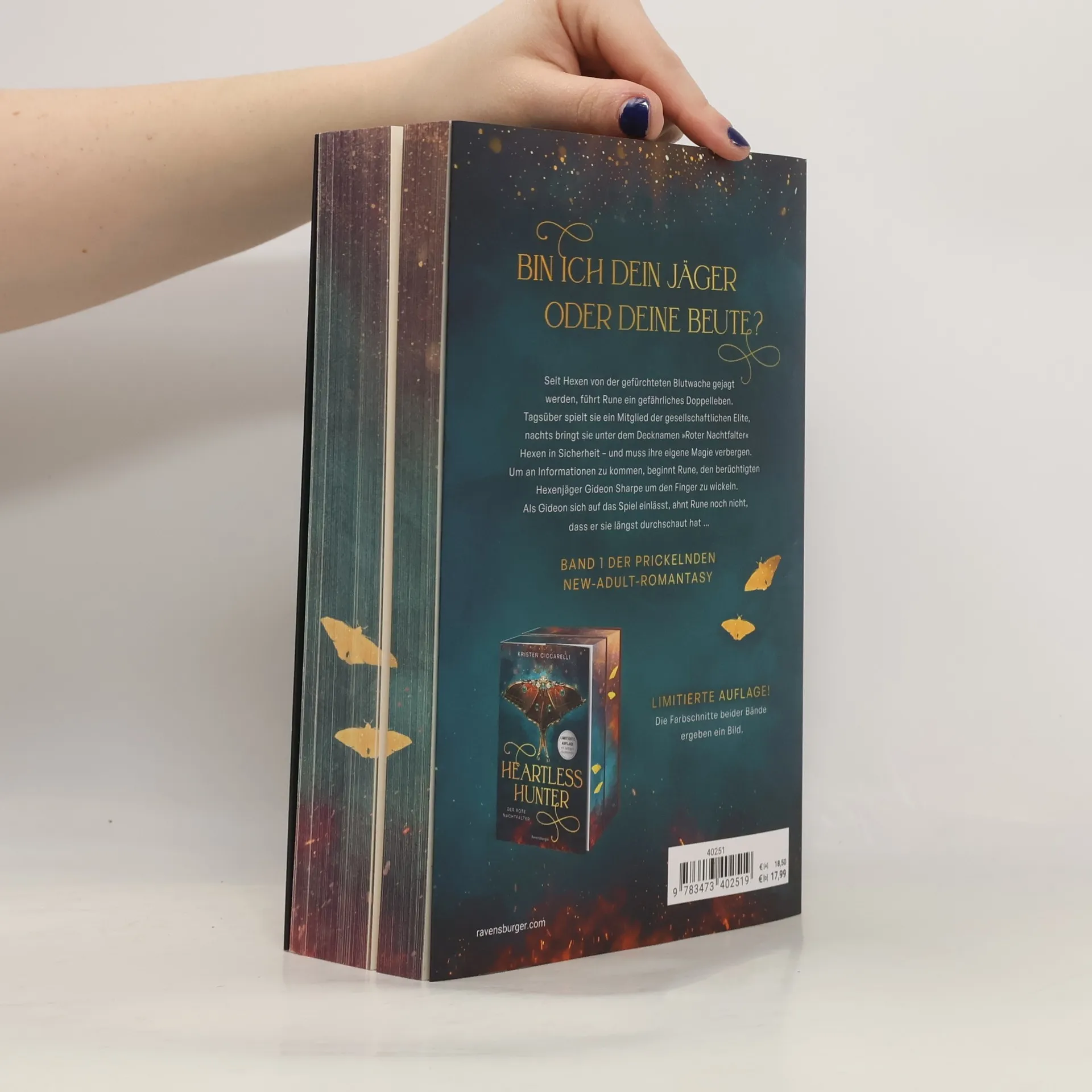 *** Limitierte Auflage mit farbigem Buchschnitt! Nur solange der Vorrat reicht! *** Bin ich dein Jäger oder deine Beute? Seit Hexen von der gefürchteten Blutwache gejagt werden, führt Rune ein gefährliches Doppelleben. Tagsüber spielt sie ein Mitglied der gesellschaftlichen Elite, nachts bringt sie unter dem Decknamen „Roter Nachtfalter“ Hexen in Sicherheit – und muss ihre eigene Magie verbergen. Um an Informationen zu kommen, beginnt Rune, den berüchtigten Hexenjäger Gideon Sharpe um den Finger zu wickeln. Als Gideon sich auf das knisternde Spiel einlässt, ahnt Rune noch nicht, dass er sie längst durchschaut hat.