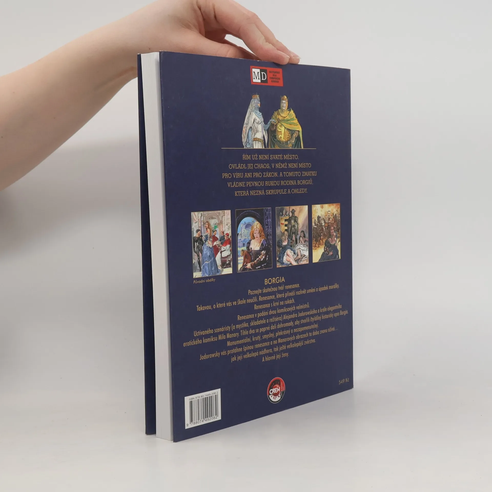 Řím už není svaté místo. Ovládl jej chaos, v němž není místo pro víru ani pro zákon. A tomuto zmatku vládne pevnou rukou rodina Borgiů, která nezná skrupule a ohledy. Poznejte skutečnou tvář renesance. Takovou, o které vás ve škole neučili. Renesance, která přináší rozkvět umění a úpadek morálky. Renesance s krví na rukách. Renesance v podání dvou komiksových velmistrů. Uctívaného scenáristy (a mystika, skladatele a režiséra) Alexandra Jodorowského a krále elegantního erotického komiksu Mila Manary. Tihle dva se poprvé dali dohromady, aby stvořili čtyřdílný historický epos Borgia. Monumentální, krutý, smyslný, překrásný a nezapomenutelný. Jodorowsky vás protáhne špínou renesance a na Manarových obrazech ta doba znovu užívá... jak její velkolepá nádhera, tak ještě velkolepější zvěrstva. A hlavně její ženy.