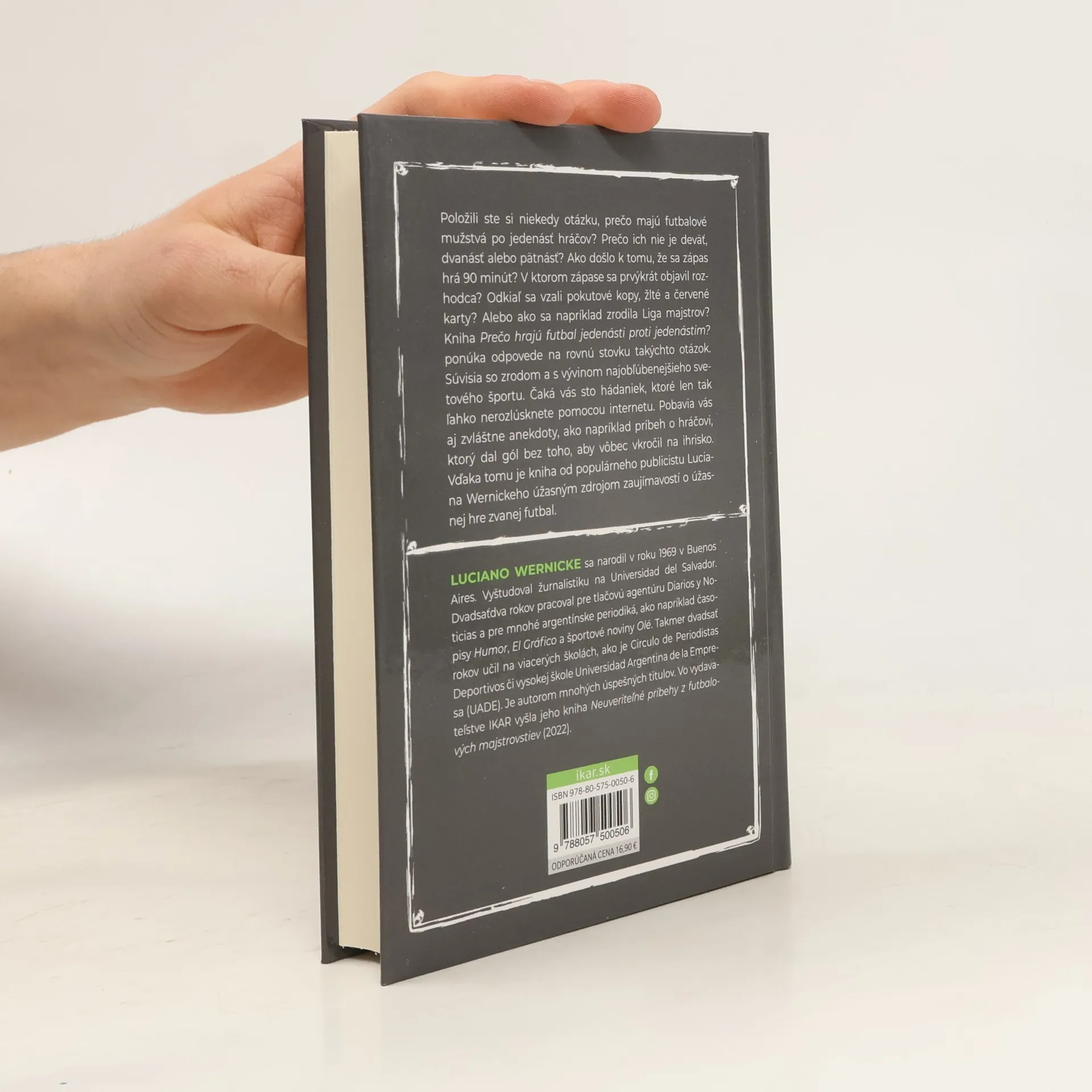 Sto zaujímavých faktov o najobľúbenejšom športe na svetePoložili ste si niekedy otázku, prečo majú futbalové mužstvá po jedenásť hráčov? Prečo ich nie je deväť, dvanásť alebo pätnásť? Ako došlo k tomu, že sa zápas hrá 90 minút? V ktorom zápase sa prvýkrát objavil rozhodca? Odkiaľ sa vzali pokutové kopy, žlté a červené karty? Alebo ako sa napríklad zrodila Liga majstrov? Kniha Prečo hrajú futbal jedenásti proti jedenástim? ponúka odpovede na rovnú stovku takýchto otázok. Súvisia so zrodom a s vývinom najobľúbenejšieho svetového športu. Čaká vás sto hádaniek, ktoré len tak ľahko nerozlúsknete pomocou internetu. Pobavia vás aj zvláštne anekdoty, ako napríklad príbeh o hráčovi, ktorý dal gól bez toho, aby vôbec vkročil na ihrisko. Vďaka tomu je kniha od populárneho publicistu Luciana Wernickeho úžasným zdrojom zaujímavostí o úžasnej hre zvanej futbal.