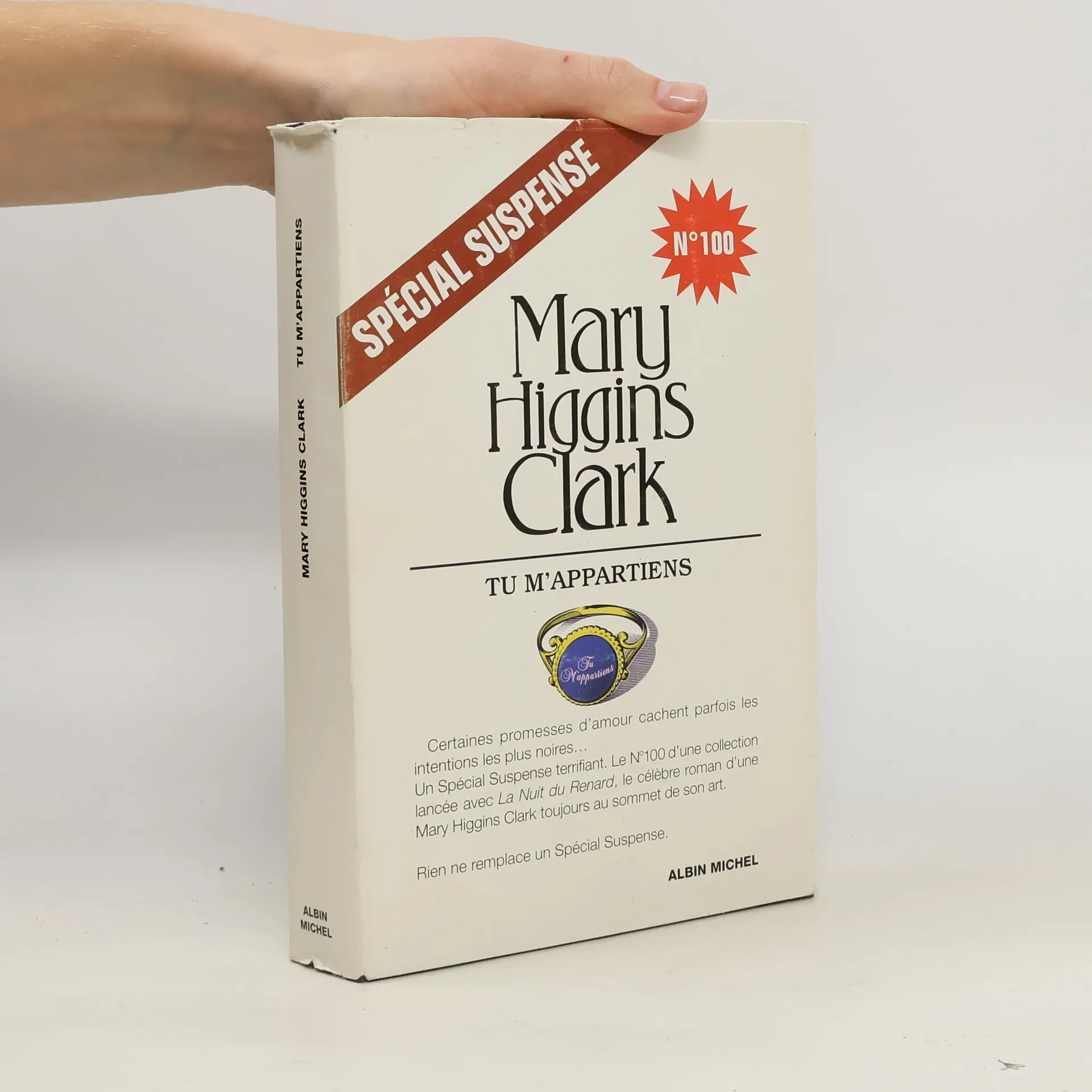 Certaines promesses d'amour cachent parfois les intentions les plus noires... Un spécial suspense terrifiant. Le N° 100 d'une collection lancée avec la Nuit du Renard, le célèbre roman d'une Mary Higgins Clark toujours au sommet de son art. Susan Chandler s'est bâti une solide réputation de psychologue. Notamment grâce à l'émission qu'elle anime sur une radio de New YorK. Mais rien ne la prépare aux dangers les plus extrêmes. Surtout pas à ceux que lui réserve l'enquête dans laquelle elle va devoir se lancer après avoir invité l'auteur d'un livre sur les mystérieuses disparitions de plusieurs femmes. Elle n'imagine pas qu'elle vient de mettre le doigt dans un terrible engrenage. Ni qu'elle va affronter la folie d'un psychopathe qui offre à ces futures victimes une bague où sont gravés les mots " tu m'appartiens ". En nous entraînant sur les traces d'un redoutable et insoupçonnable " serial killer ". Mary Higgins Clark prouve une fois encore toute sa maîtrise. Cette course poursuite d'une femme contre la mort est sans doute l'un des titres - le 100e Spécial suspense ! - qui marqueront la collection. Epoustouflant, implacable, un nouveau chef-d'œuvre du suspense qui vous surprendra.