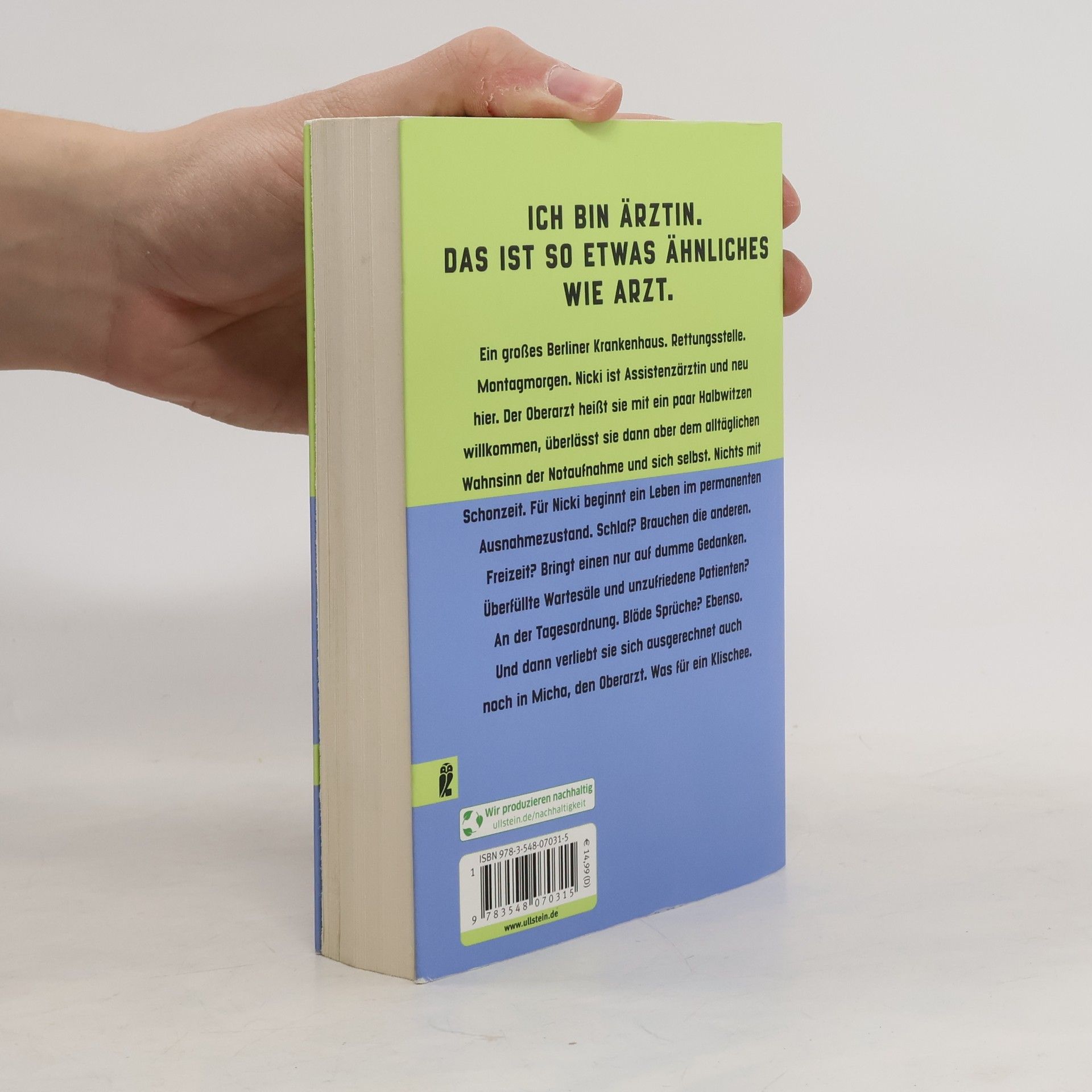ICH BIN ÄRZTIN. DAS IST SO ETWAS ÄHNLICHES WIE ARZT. Ein großes Berliner Krankenhaus. Rettungsstelle. Montagmorgen. Nicki ist Assistenzärztin und neu hier. Der Oberarzt heißt sie mit ein paar Halbwitzen willkommen, überlässt sie dann aber dem alltäglichen Wahnsinn der Notaufnahme und sich selbst. Nichts mit Schonzeit. Für Nicki beginnt ein Leben im permanenten Ausnahmezustand. Schlaf? Brauchen die anderen. Freizeit? Bringt einen nur auf dumme Gedanken. Überfüllte Wartesäle und unzufriedene Patienten? An der Tagesordnung. Blöde Sprüche? Ebenso. Und dann verliebt sie sich ausgerechnet auch noch in Micha, den Oberarzt. Was für ein Klischee.