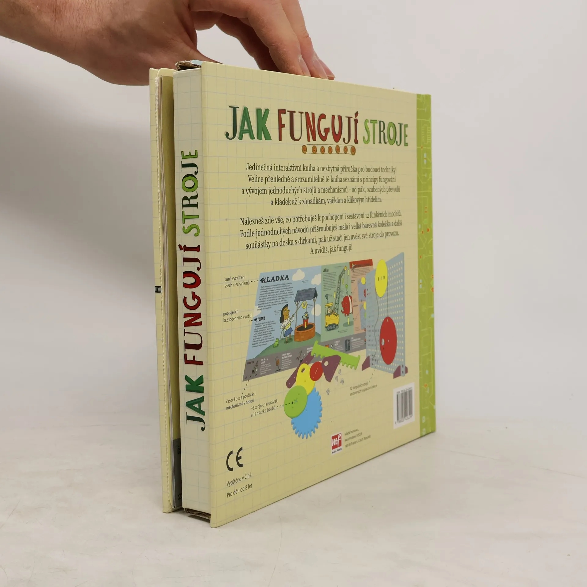 Kniha velice přehledně a srozumitelně seznamuje s principy fungování a vývojem jednoduchých strojů a mechanismů – od pák, ozubených převodů a kladek až k západkám, vačkám a klikovým hřídelím. Každý mechanismus je názorně popsán a vysvětlen a nechybí zde ani časová osa znázorňující proměny využití jednotlivých principů síly v čase. Součástí knihy je praktická část – 12 funkčních modelů, které si čtenáři mohou sami sestavit. Podle jednoduchých návodů lze přišroubovat malá i velká barevná kolečka a další součástky na desku s dírkami, a pak už stačí jen uvést své stroje do provozu.