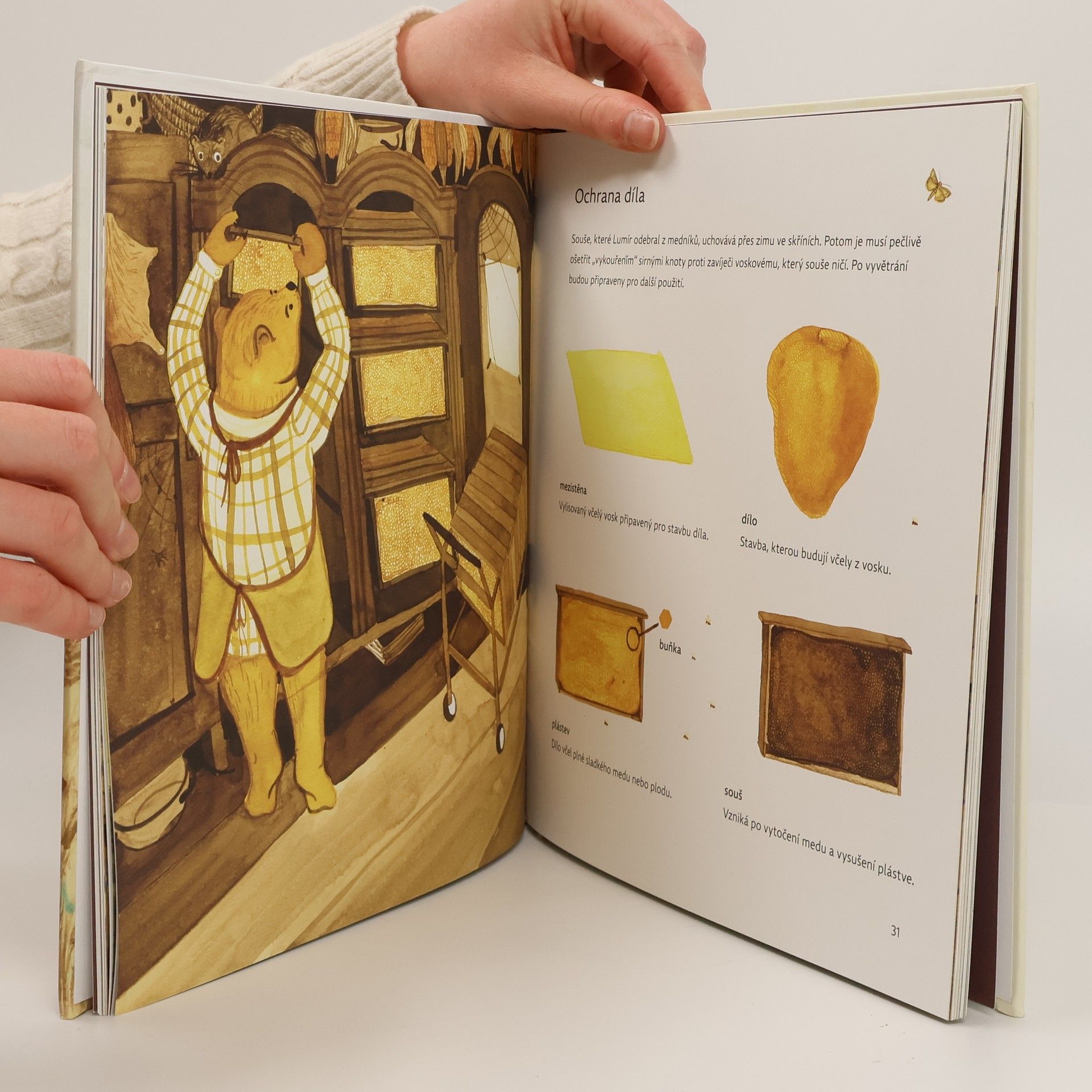 Medvěd Lumír, hlavní postava této dětské knihy, provází čtenáře celým včelařským rokem: od podletí až k medodobraní, kde včely berou vosk k stavbě svého díla, co je to propolis a k čemu slouží, jak funguje včelí společenství a kdo co v úle dělá.