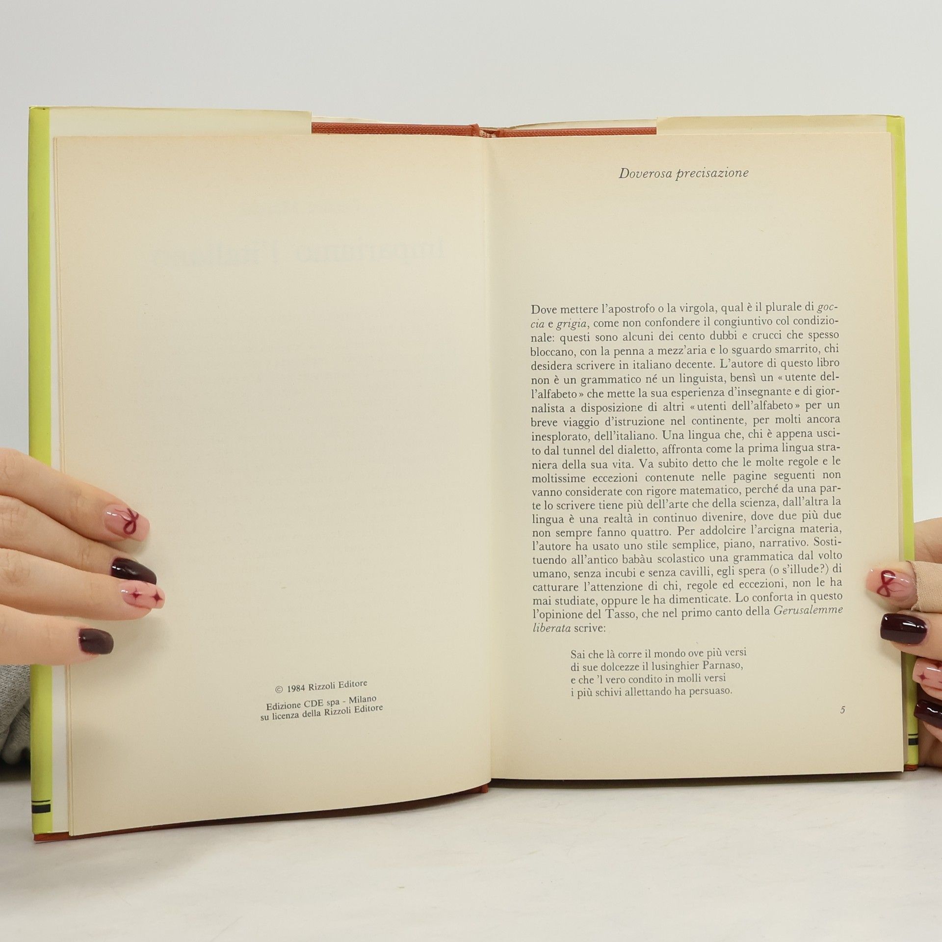 Qual è il plurale di goccia o di ciliegia? Quando mettere l'apostrofo e quando l'accento? Quale preposizione usare? Come distinguere il congiuntivo dal condizionale? Dubbi e crucci di tal fatta spesso bloccano, con la penna a mezz'aria, chi desidera scrivere in un italiano decente. Una lingua complessa per gli stranieri che la studiano, e ignota ai tanti italiani che non l'hann omai studiata davvero. Questo volume conduce il lettore fra i trabocchetti della grammatica, gli ostacoli della sintassi e i misteri dell'etimologia, spiegando regole, eccezioni ed evoluzioni della lingua.