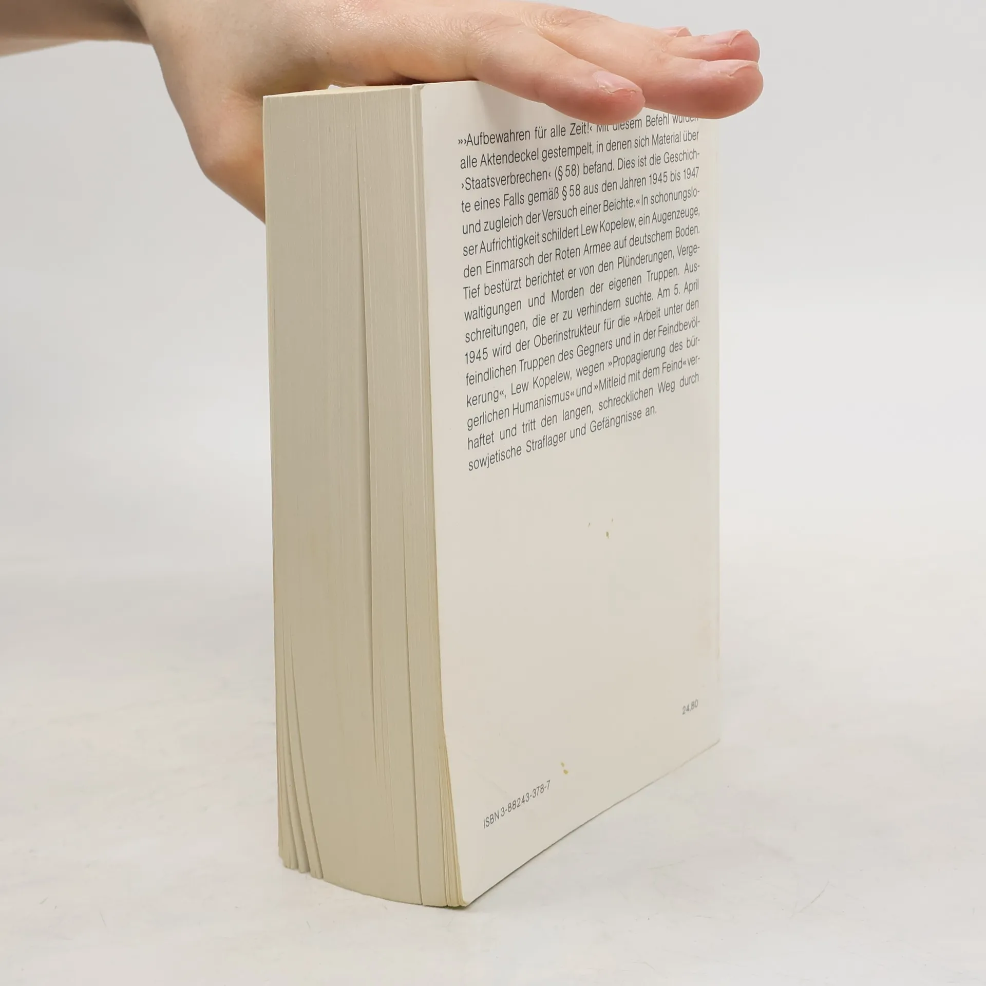 Aufbewahren für alle Zeit! Mit diesem Befehl wurden alle Aktendeckel gestempelt, in denen sich Material über -Staatsverbrechen-(Paragraph 58) befand. Dies ist die Geschichte eines Falls gemäß Paragraph 58 aus den Jahren 1945 bis 1947 und zugleich der Versuch einer Beichte. In schonungsloser Aufrichtigkeit schildert Lew Kopelew, ein Augenzeuge, den Einmarsch der roten Armee in deutsches Gebiet. Tief bestürzt berichtet er von den Plünderungen, Vergewaltigungen und Morden der eigenen Truppen. Ausschreitungen, die er zu verhindern suchte. Am 5. April 1945 wird der Oberinstrukteur für die -Arbeit unter den feindlichen Truppen des Gegners und in der Feindbevölkerung-, Lew Kopelew, wegen -Propagierung des bürgerlichen Humanismus- und -Mitleid mit dem Feind- verhaftet und tritt den langen, schrecklichen Weg durch sowjetische Straflager und Gefängnisse an.
