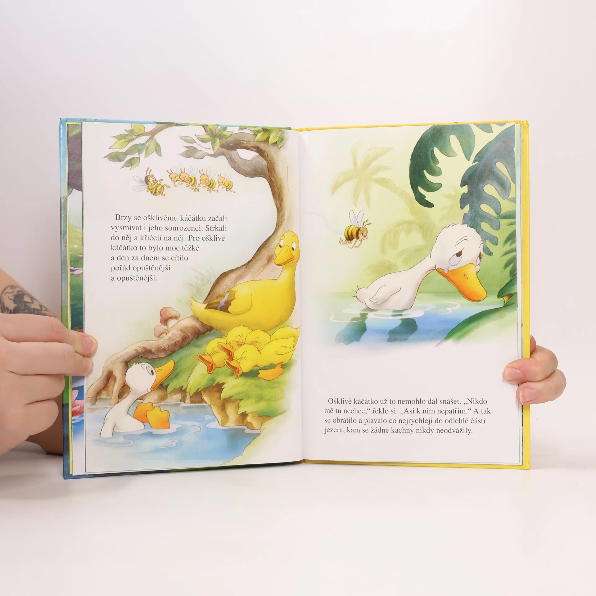 Jednoho letního dne se matce kačeně vylíhlo pět káčátek. Čtyři z nich byla krásně heboučká a žluťoučká, jen to páté se na první pohled moc nevyvedlo. Co jen si ošklivé káčátko kvůli tomu od ostatních kachen vytrpělo! Ale nakonec přece jen našlo rodinu, ktará ho přijala mezi sebe.