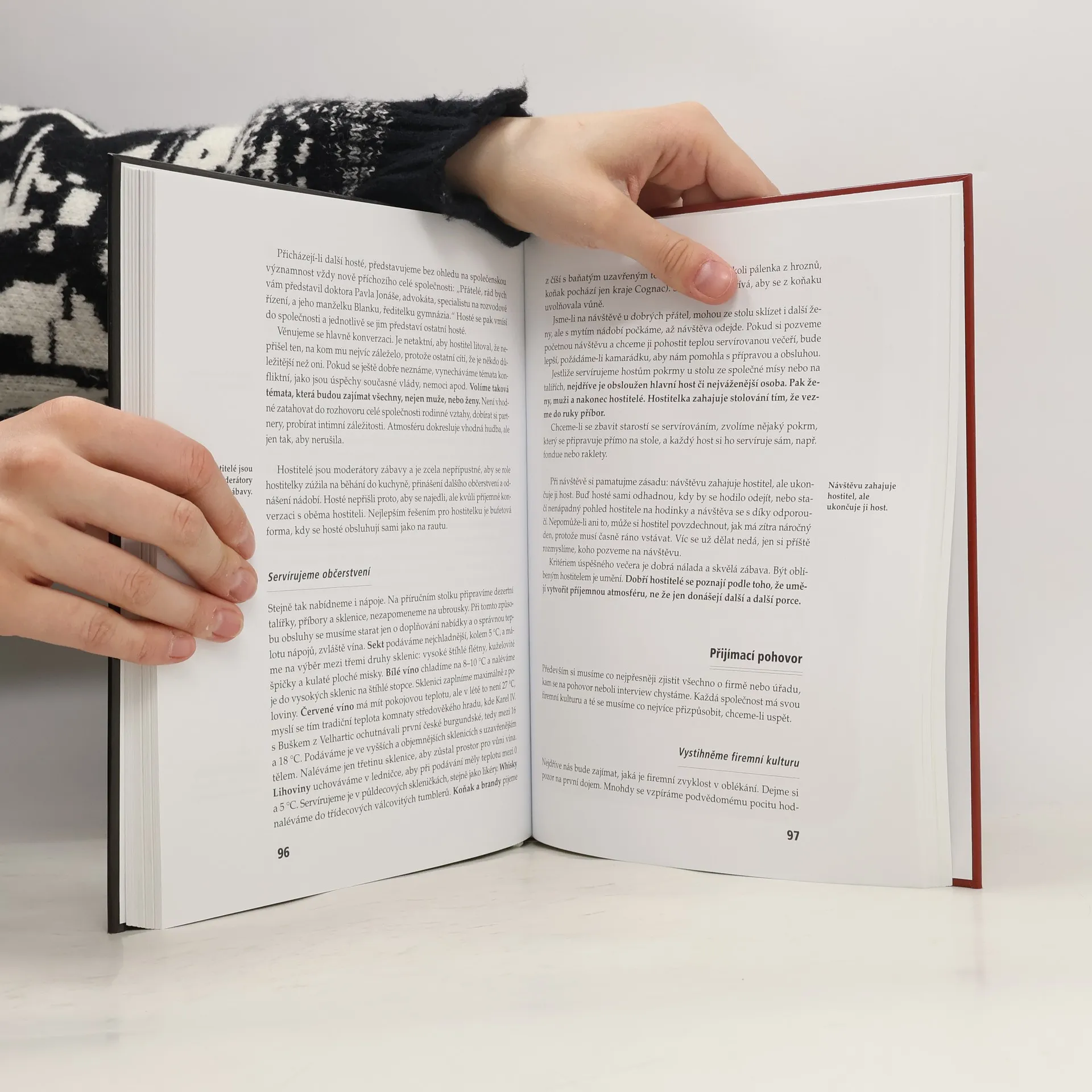 Kniha je univerzální průvodce různými společenskými událostmi. Seznamuje čtenáře se všemi formami společenského styku, se správným řešením společenských situací, s pravidly jednání jak doma, tak v cizině. Množstvím informací a rad překonává všechny dosud vydané příručky společenského chování. Poskytuje praktické návody, jak se chovat ve společnosti, v kanceláři, na ulici i doma, jak správně stolovat, jak se oblékat, jak se chovat na recepci, na banketu, jak připravit návštěvu ústavního činitele, jak jednat se zahraničními partnery. Vychází ze soudobého pojetí etikety a protokolu. Je nezbytnou pomůckou pro školu, úřad, firmu i rodinu.... celý text