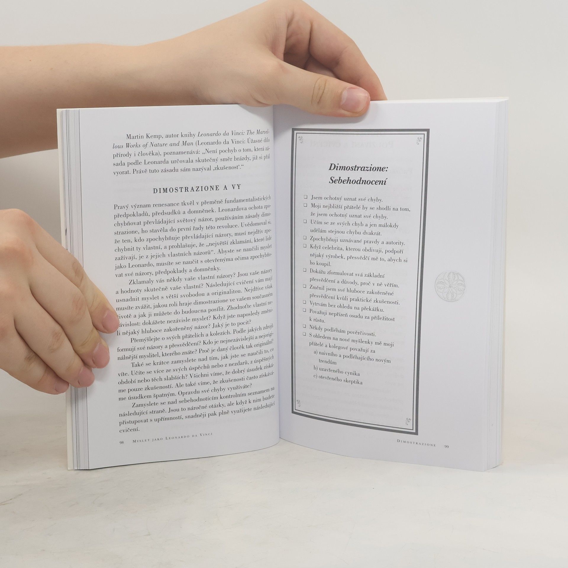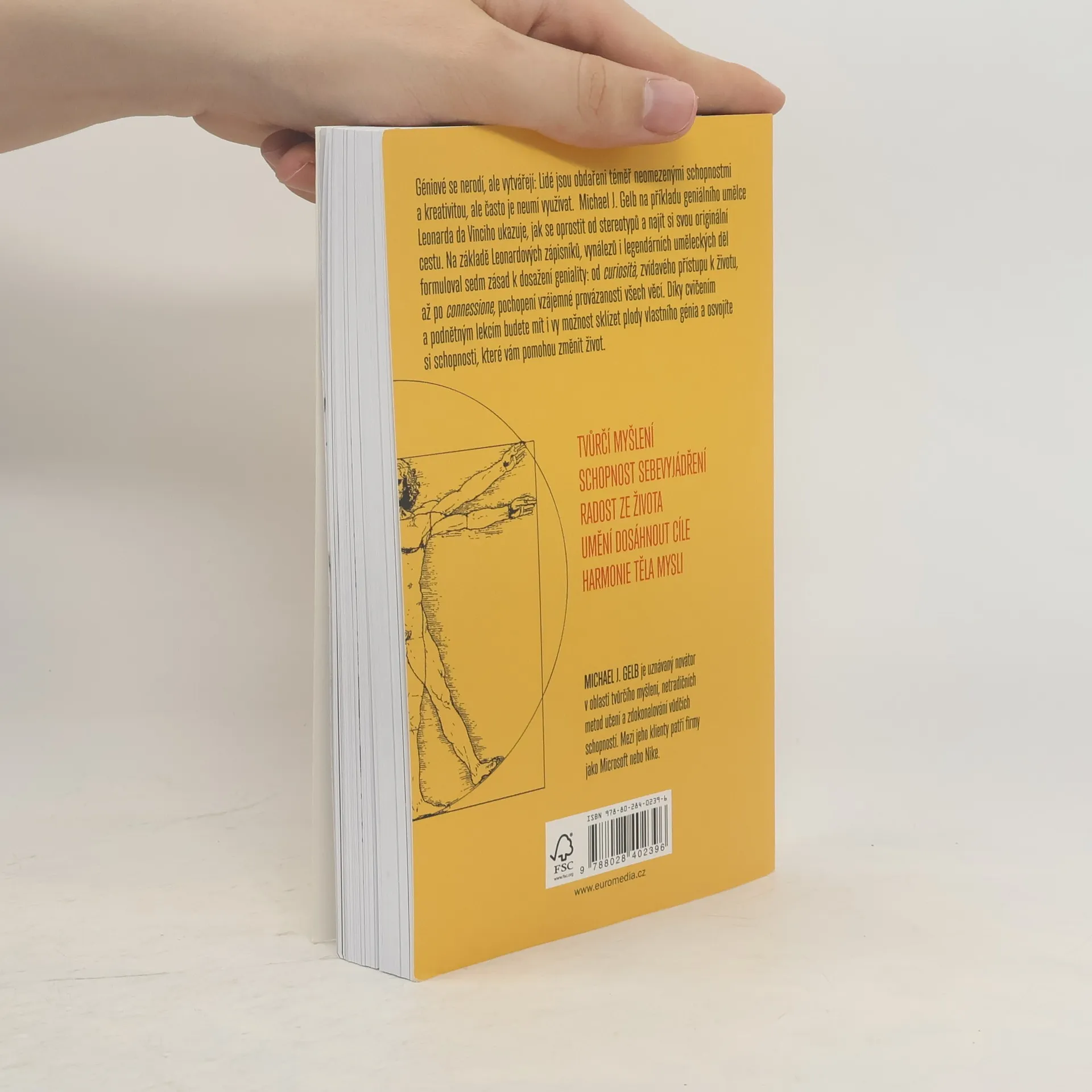 Géniové se nerodí, ale vytvářejí: Lidé jsou obdařeni téměř neomezenými schopnostmi a kreativitou, ale často je neumí využívat. Michael J. Gelb na příkladu geniálního umělce Leonarda da Vinciho ukazuje, jak se oprostit od stereotypů a najít si svou originální cestu. Na základě Leonardových zápisníků, vynálezů i legendárních uměleckých děl formuloval sedm zásad k dosažení geniality: od curiosita, zvídavého přístupu k životu, až po connessione, pochopení vzájemné provázanosti všech věcí. Díky cvičením a podnětným lekcím budete mít i vy možnost sklízet plody vlastního génia a osvojíte si schopnosti, které vám pomohou změnit život.