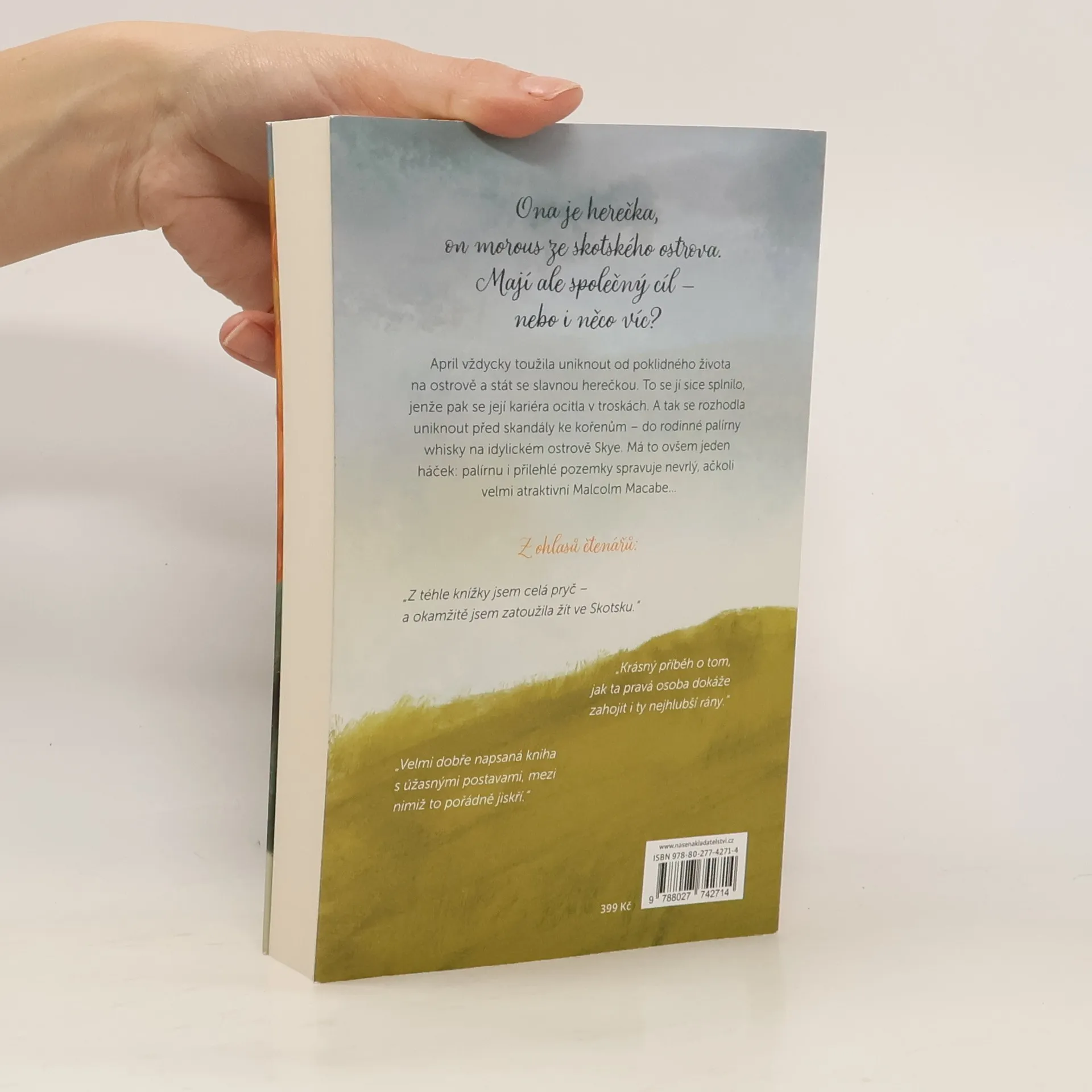 Když se herecká kariéra hollywoodské hvězdy April Sinclairové ocitne v troskách, rozhodne se odjet si lízat rány zpátky do svého rodného města na skotském ostrově Skye. V zoufalé potřebě odvést myšlenky jinam si vytyčí za cíl navrátit zašlou slávu rodinné palírně whisky. Nečeká však, že ji má na starosti prchlivý a naprosto neodolatelný Malcolm Macabe. Mal má v životě tři lásky: whisky, svého psa a svůj klid. Nemá čas na zhýčkanou princeznu, i když si zrovna na ni vždycky myslel. Jenže pak na dlouho odjela… Mal, jemuž je lépe ve stínu než ve světle reflektorů, ji nějak strpí. Stejně ji to tu nakonec přestane bavit a uteče zpátky do svého nablýskaného světa. Jejich společná touha zachránit palírnu však bude vyžadovat o hodně bližší spolupráci, než si možná oba dovedou připustit…