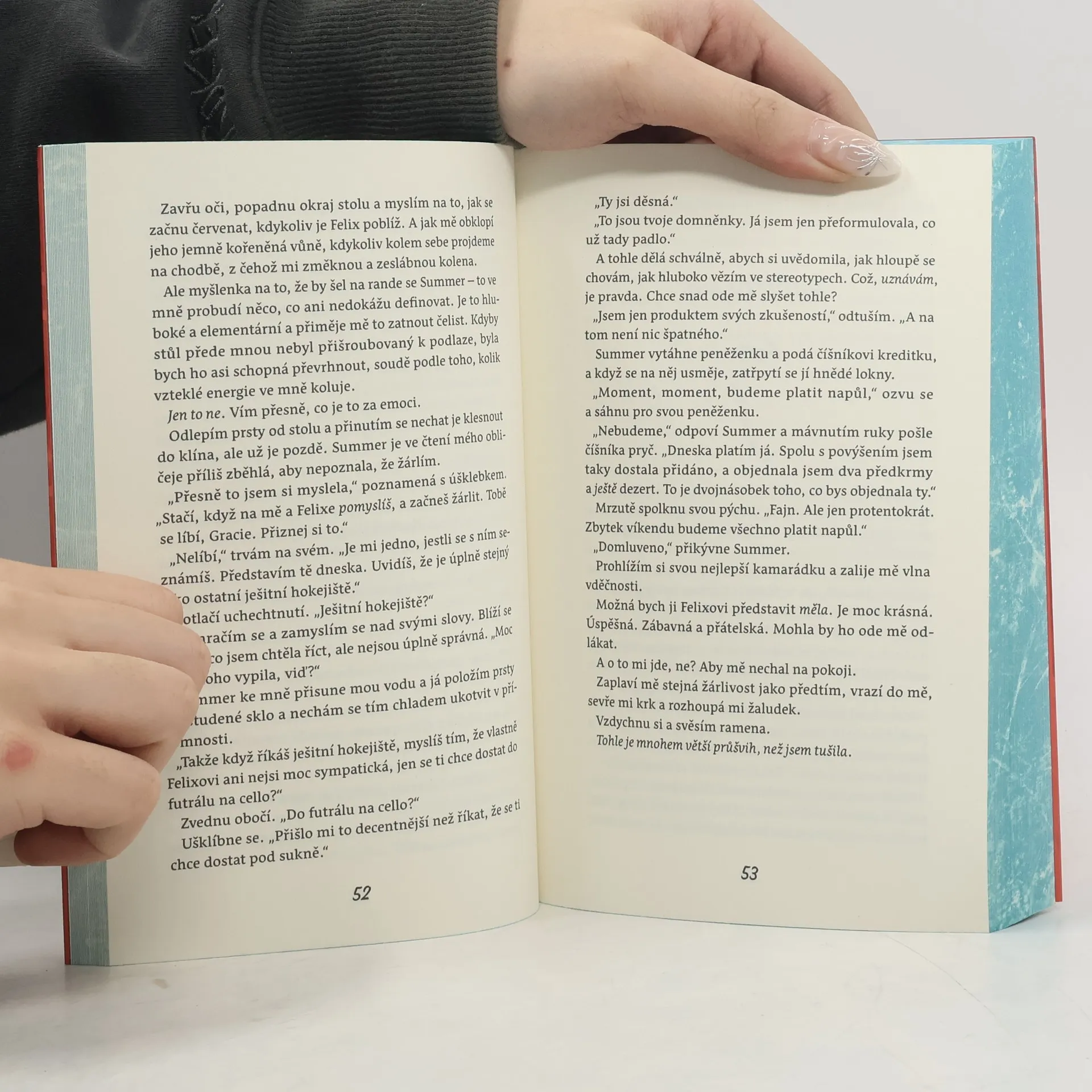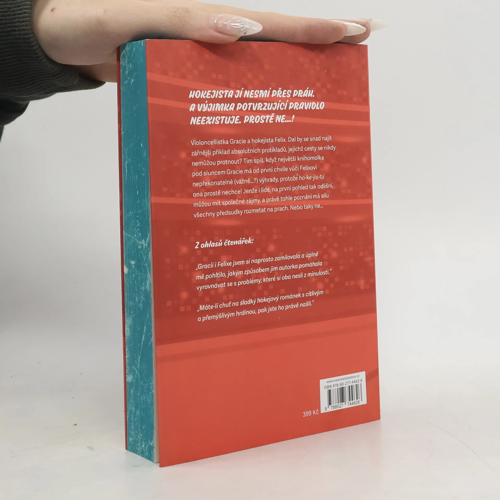 Moje požadavky na muže jsou jednoduché. Musí milovat knihy. NESMÍ milovat hokej. A proto se ani nepodívám na svého souseda, rezervovaného a tajemného Felixe Jamisona, bez ohledu na to, kolik knih ho vidím tahat do svého bytu. Dokud nezahodí brusle, nemá u mě šanci. Ale pak se ukáže na koncertě symfonického orchestru, kde hraju, a já zaslechnu, jak na chodbu pronikají sladké tóny Dvořáka. A už jsem se zmínila o tom, jak neuvěřitelně mu to sluší v dresu? Ale i tak, k hokeji mám od dětství komplikovaný vztah. Můj starší brácha ho hrával a řekněme jen, že se koupal v záři tolika reflektorů, že to způsobilo blackout na celém pobřeží. Tak dlouho jsem musela být součástí toho světa, že teď, když si můžu vybrat, je to ta poslední věc, kterou bych chtěla. Ale něco mi říká, že kvůli Felixovi možná změním názor…