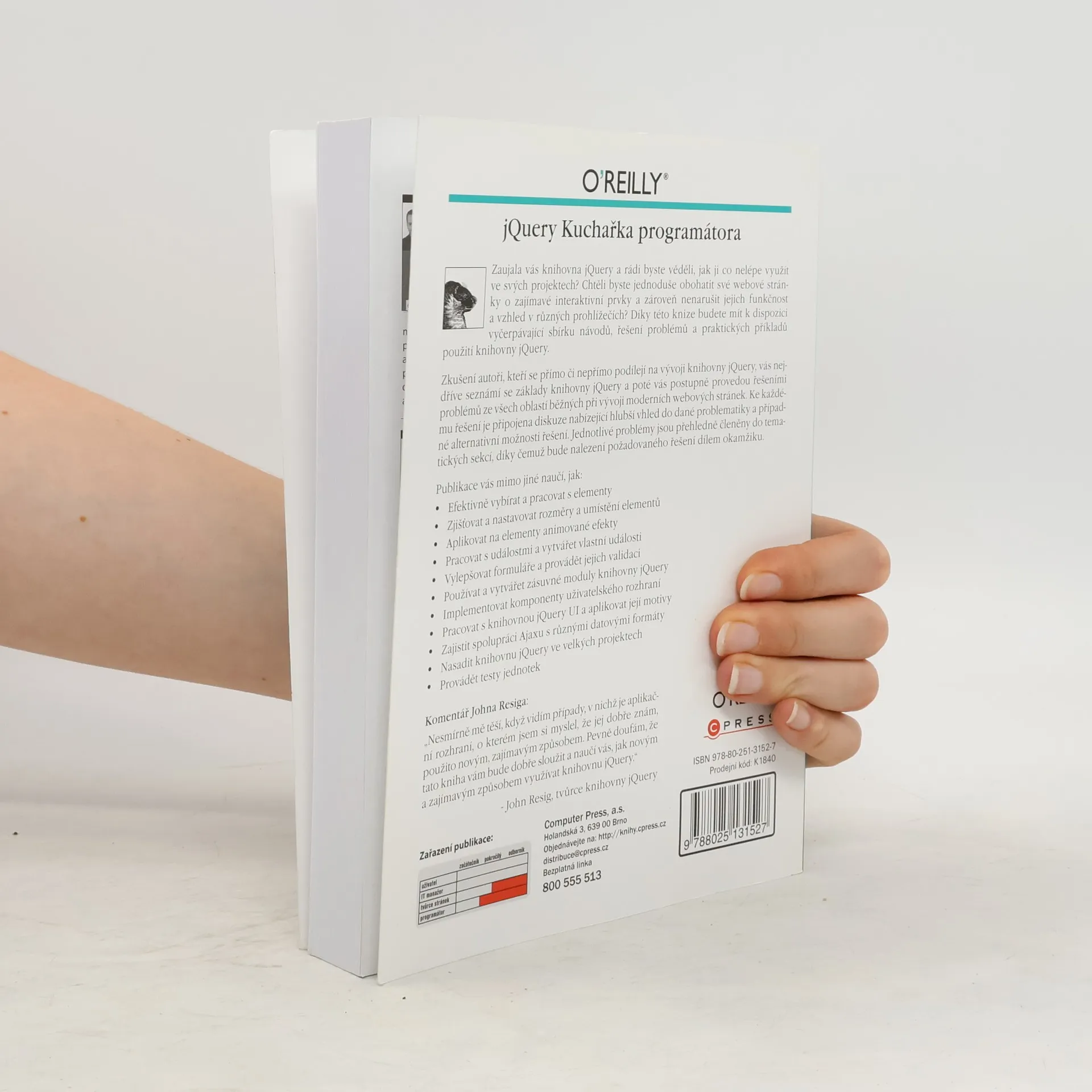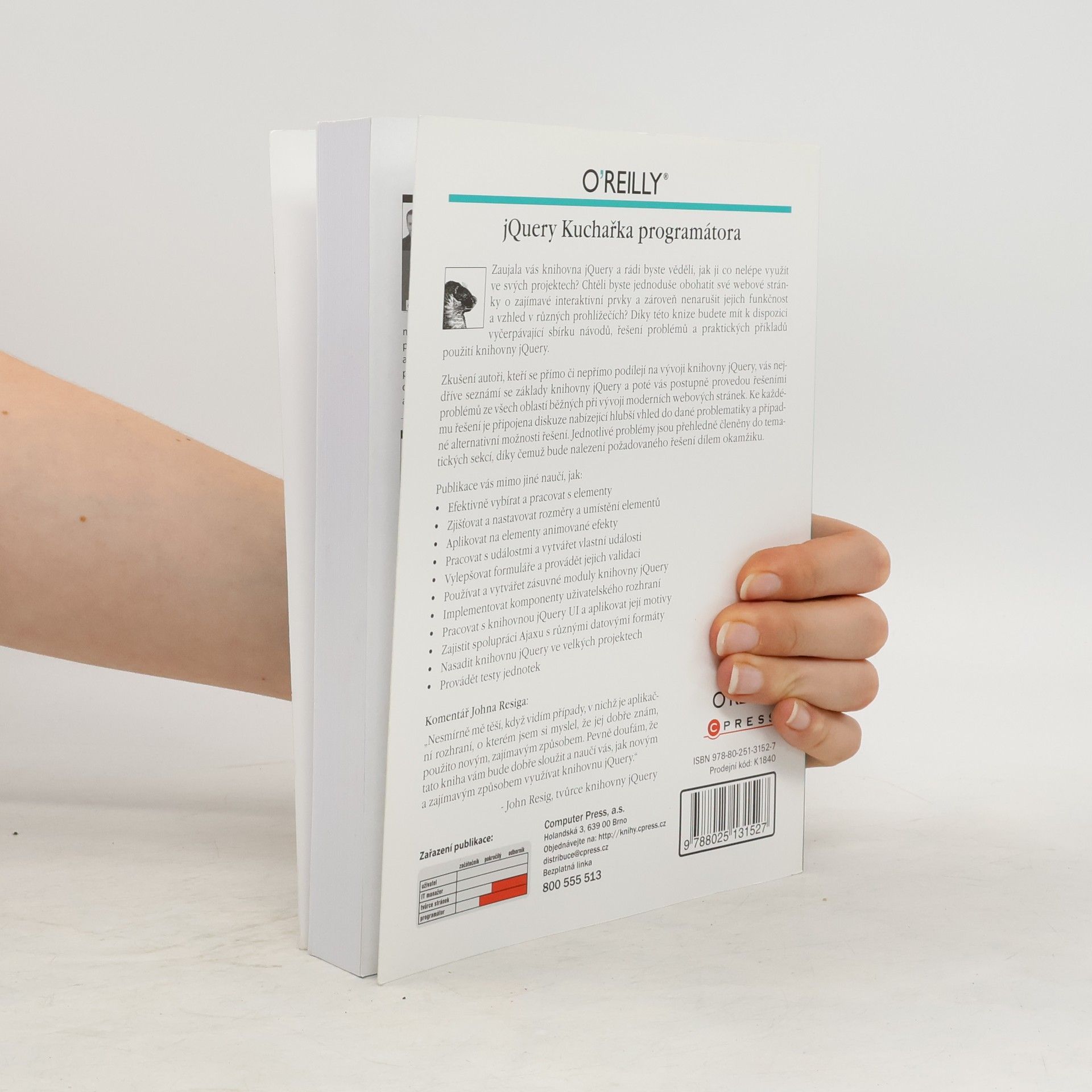 Zaujala vás knihovna jQuery a rádi byste věděli, jak ji co nelépe využít ve svých projektech? Chtěli byste jednoduše obohatit své webové stránky o zajímavé interaktivní prvky a zároveň nenarušit jejich funkčnost a vzhled v různých prohlížečích? Díky této knize budete mít k dispozici vyčerpávající sbírku návodů, řešení problémů a praktických příkladů použití knihovny jQuery. Zkušení autoři, kteří se přímo či nepřímo podílejí na vývoji knihovny jQuery, vás nejdříve seznámí se základy knihovny jQuery a poté vás postupně provedou řešeními problémů ze všech oblastí běžných při vývoji moderních webových stránek. Ke každému řešení je připojena diskuze nabízející hlubší vhled do dané problematiky a případné alternativní možnosti řešení. Jednotlivé problémy jsou přehledně členěny do tematických sekcí, díky čemuž bude nalezení požadovaného řešení dílem okamžiku.